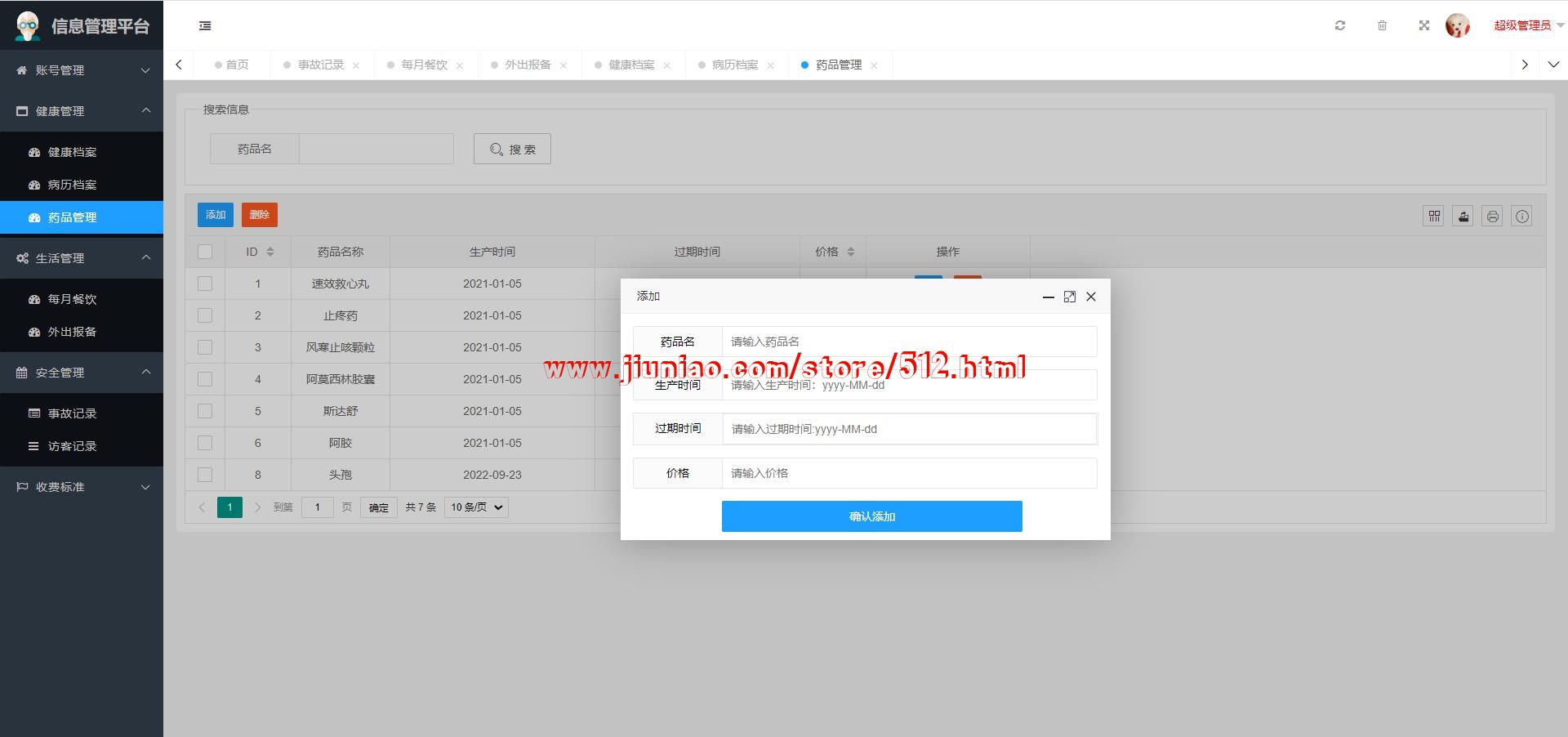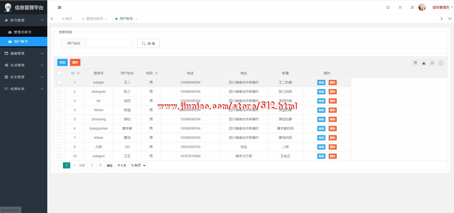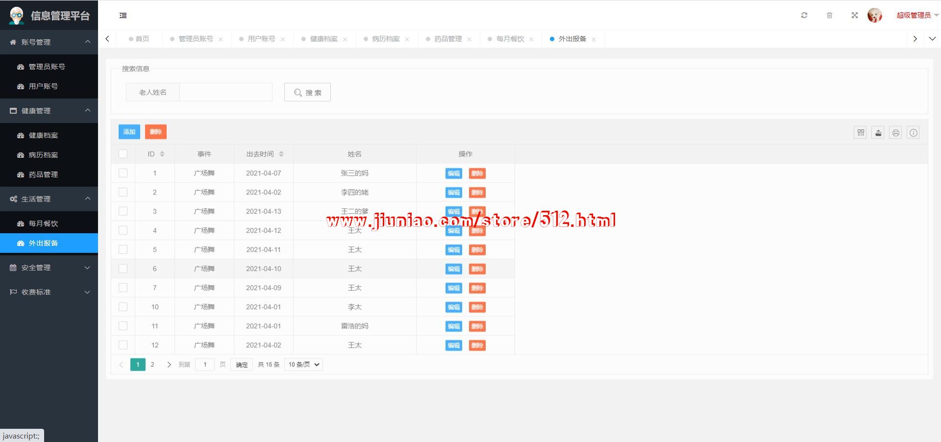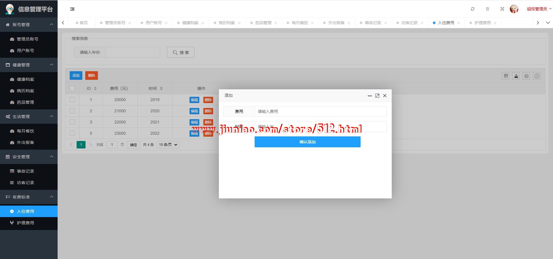 超级管理员:账号管理(管理员账号、用户账号)、健康管理(健康档案、病历档案、药品管理)、生活管理(每月餐饮、外出报备)、入住管理(入住登记、寝室分配)、安全管理(事故记录、访客记录)、收费标准(入住费用、护理费用)等;