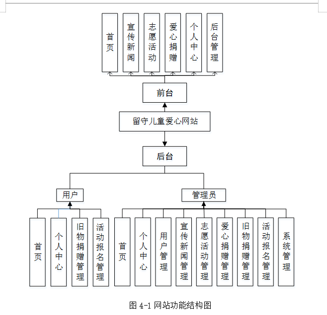留守儿童爱心网站采用了B/S结构,JAVA作为开发语言,数据库采用了B/S结构,Mysql数据库进行开发。该系统包括前台操作,后台由管理员和用户两个部分,一方面,为用户提供首页、宣传新闻、志愿活动、爱心捐赠、个人中心、后台管理等功能;另一方面,为管理员提供首页、个人中心、用户管理、宣传新闻管理、志愿活动管理、爱心捐赠管理、旧物捐赠管理、活动报名管理、系统管理等功能。