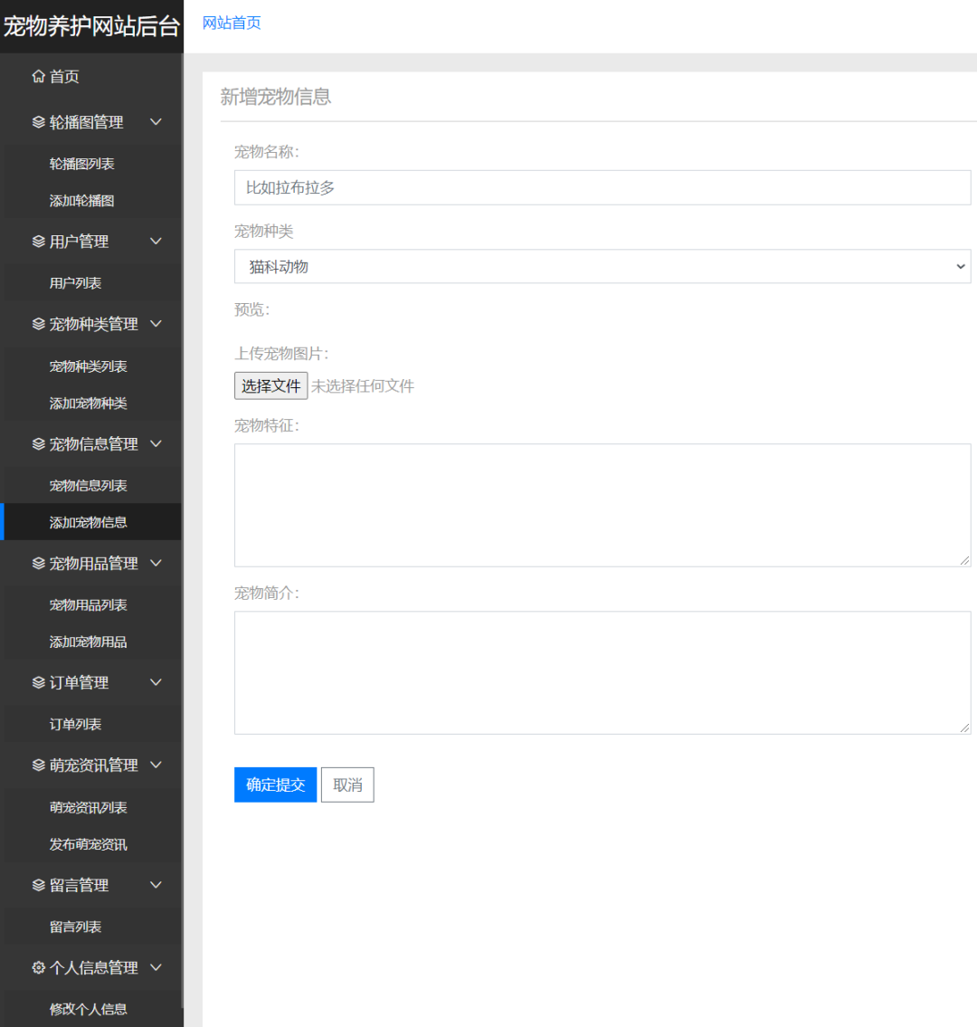 项目简介:本网站主要是用于展示宠物品种信息、宠物养护用品信息、宠物咨询信息、关于我们、提交联系方式、解惑答疑等服务,而后台主要是对网站的信息进行信息化管理。主要有登录、轮播图管理、宠物品种管理、宠物信息管理、宠物用品管理、宠物资讯管理、用户联系管理等功能模块。