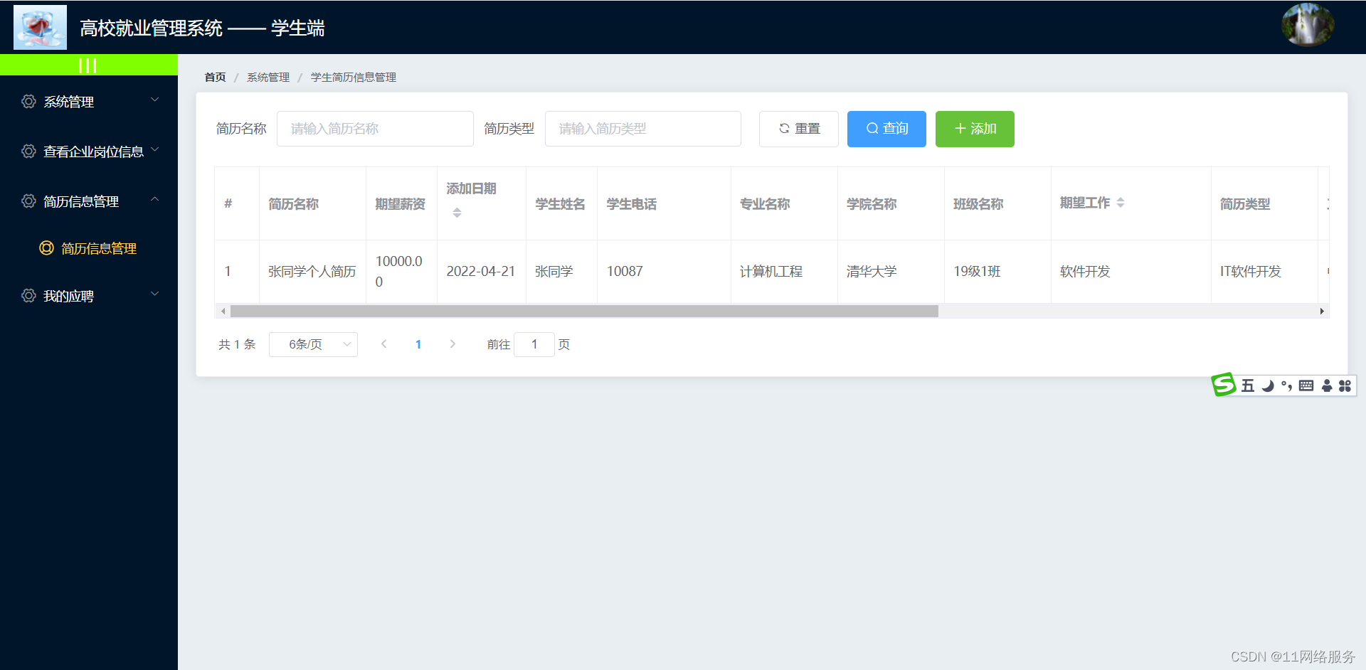 学生 : 个人信息、查看企业岗位信息、简历信息管理、我的应聘