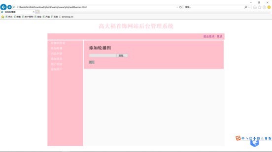 此模块包括用户的注册和登录的功能。 2. 特许加盟模块:此模块介绍了加盟本品牌的一些流程。 3. 高大福首饰模块:此模块对本品牌进行了一些简单的介绍。 4. 动态时间显示模块:此模块用于显示用户访问本页面具体的年份时间。 后台 1. 添加轮播图模块:此模块用于添加轮播图。 2. 添加商品模块:此模块用于添加商品的名称、价格、介绍。 3. 添加用户模块:此模块用于添加新用户。 4.管理员登录模块