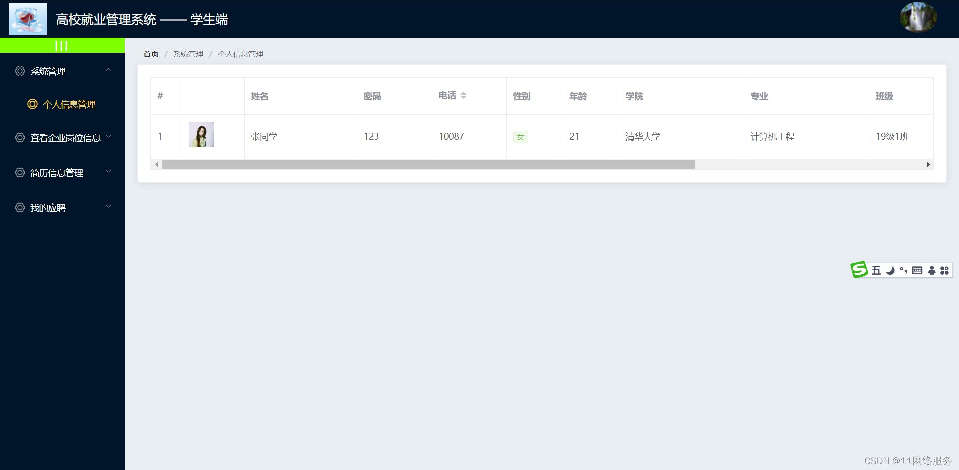 学生 : 个人信息、查看企业岗位信息、简历信息管理、我的应聘