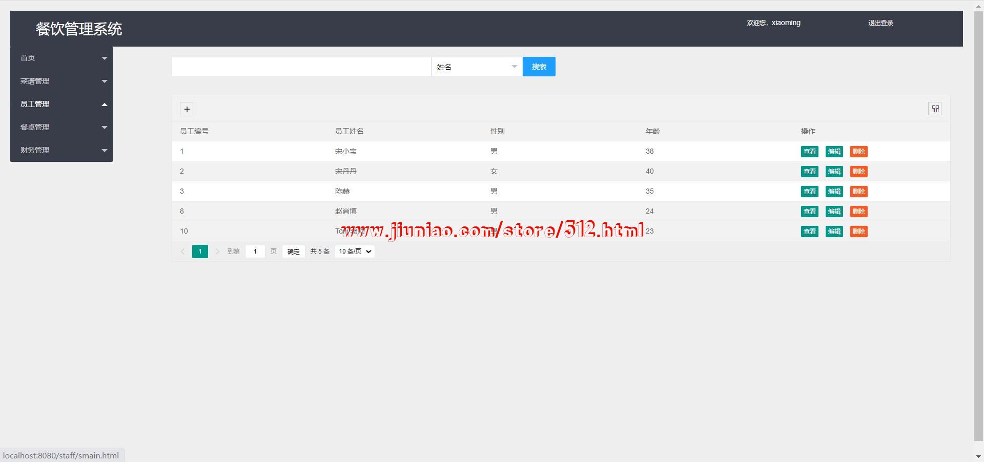 老板:首页(查看餐桌使用情况、下单)、菜谱管理(查看菜品信息、新增菜品信息、修改菜品信息)、员工管理(查询员工信息、修改员工信息、新增员工信息、删除指定员工)、餐桌管理(查询餐桌、新增餐桌、修改餐桌、删除指定餐桌)、历史订单、财务统计(查询指定日期营业额、订单数)