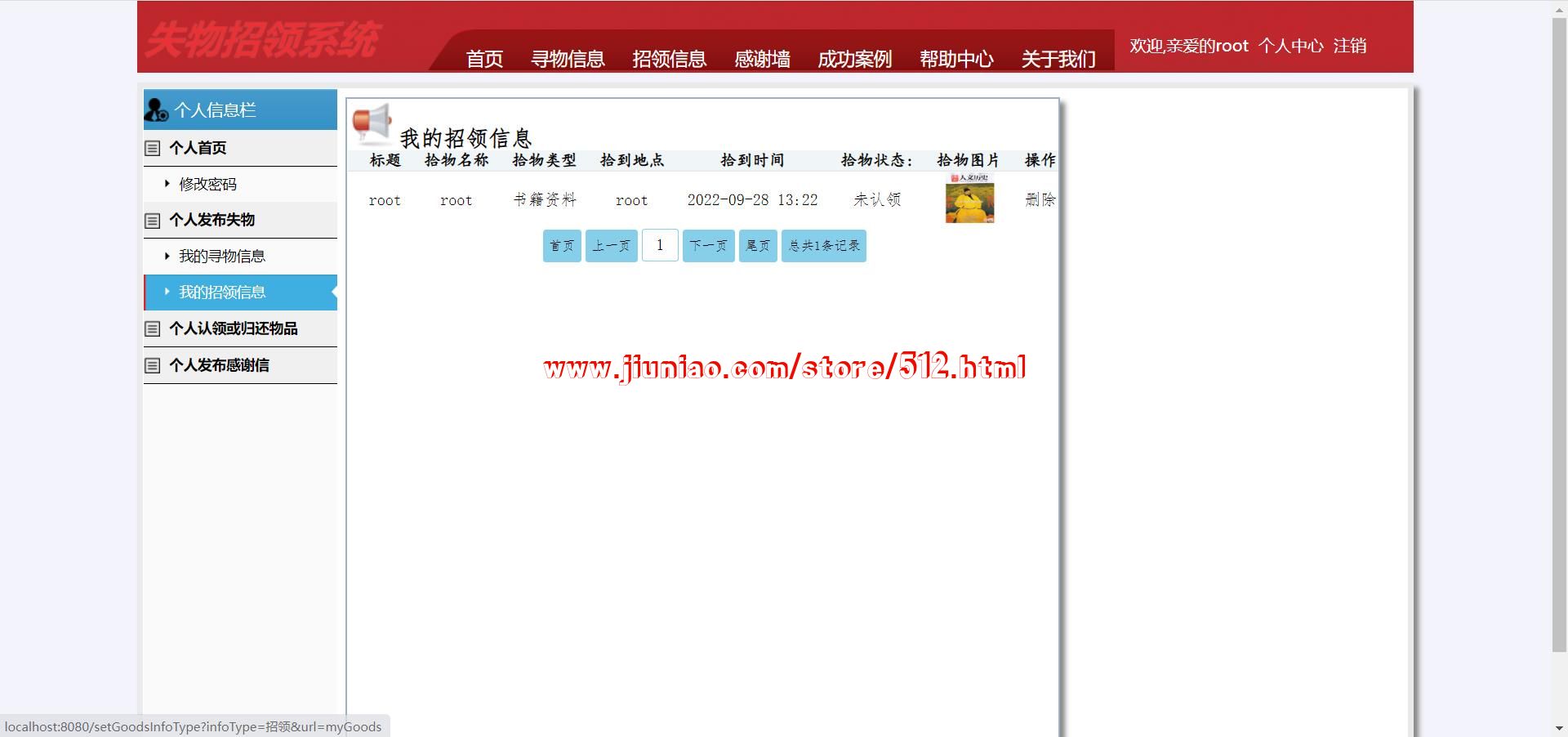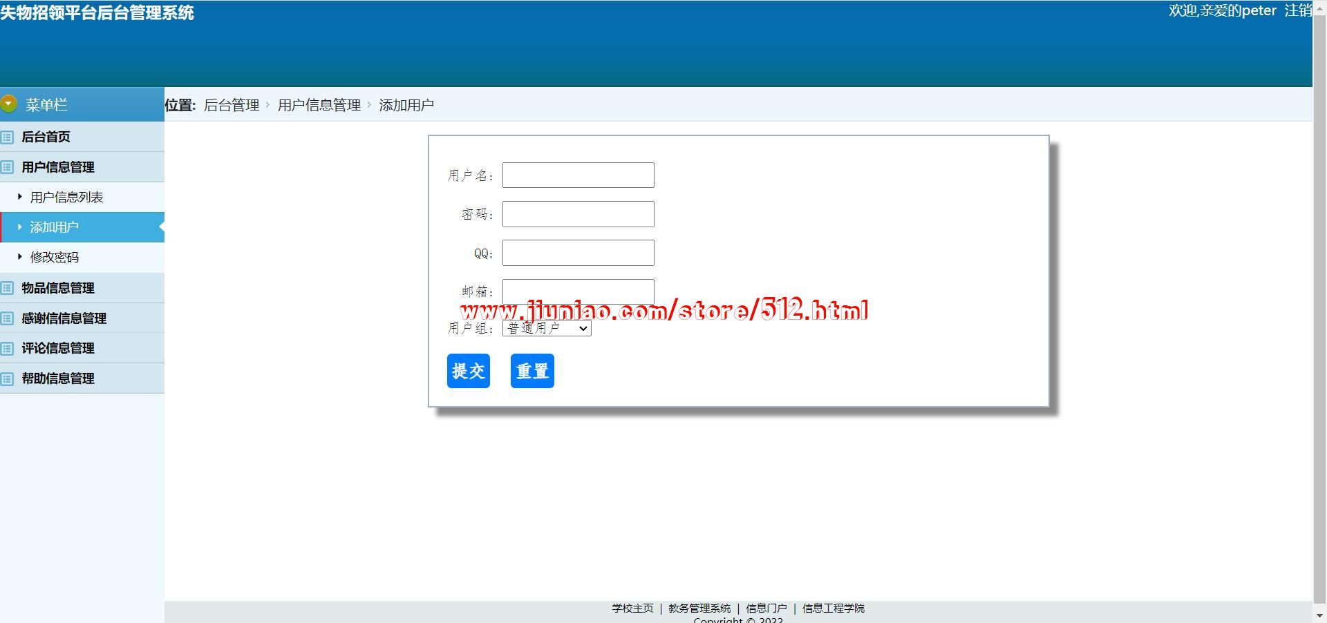 管理员:用户信息列表(查询用户、编辑用户信息、删除用户信息)、添加用户、修改密码、寻物信息列表(查询寻物信息、删除寻物信息、取消已找到物品)、招领信息列表(查询招领信息、删除招领信息、取消认领)、感谢信列表(查询感谢信、删除感谢信、查看感谢信具体内容)、评论列表(查询评论、删除评论、查看评论内容)、帮助信息列表(编辑帮助信息、删除帮助信息)、添加帮助信息;