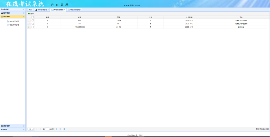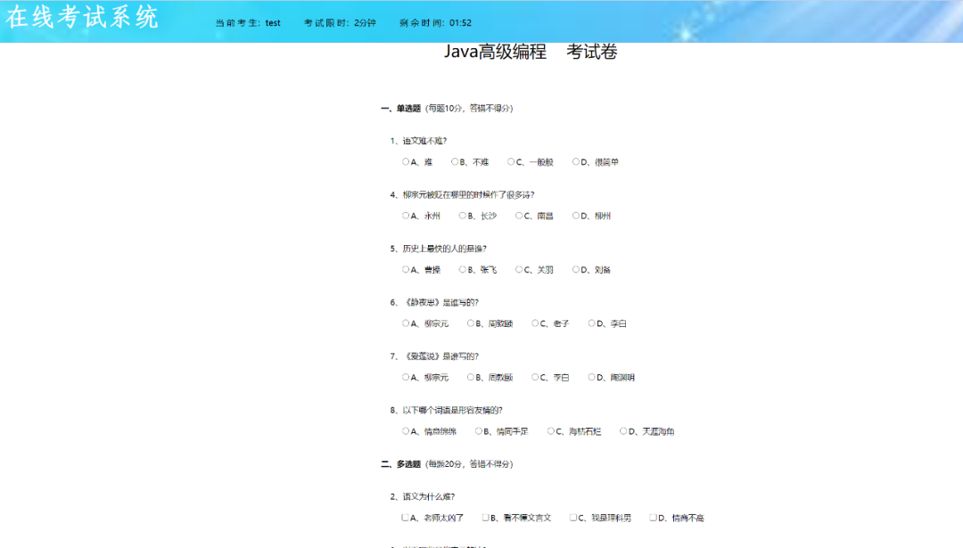 项目简介:在线考试系统主要的功能模块有考生登录、教师登录,考生个人信息修改、在线考试、查看成绩的功能,后台主要有试卷管理和考生管理、以及教师管理等功能模块,考生登录以后可以选课课程进行做题,题目限于单选题和多选题,做题完毕之后可以交卷查看成绩。