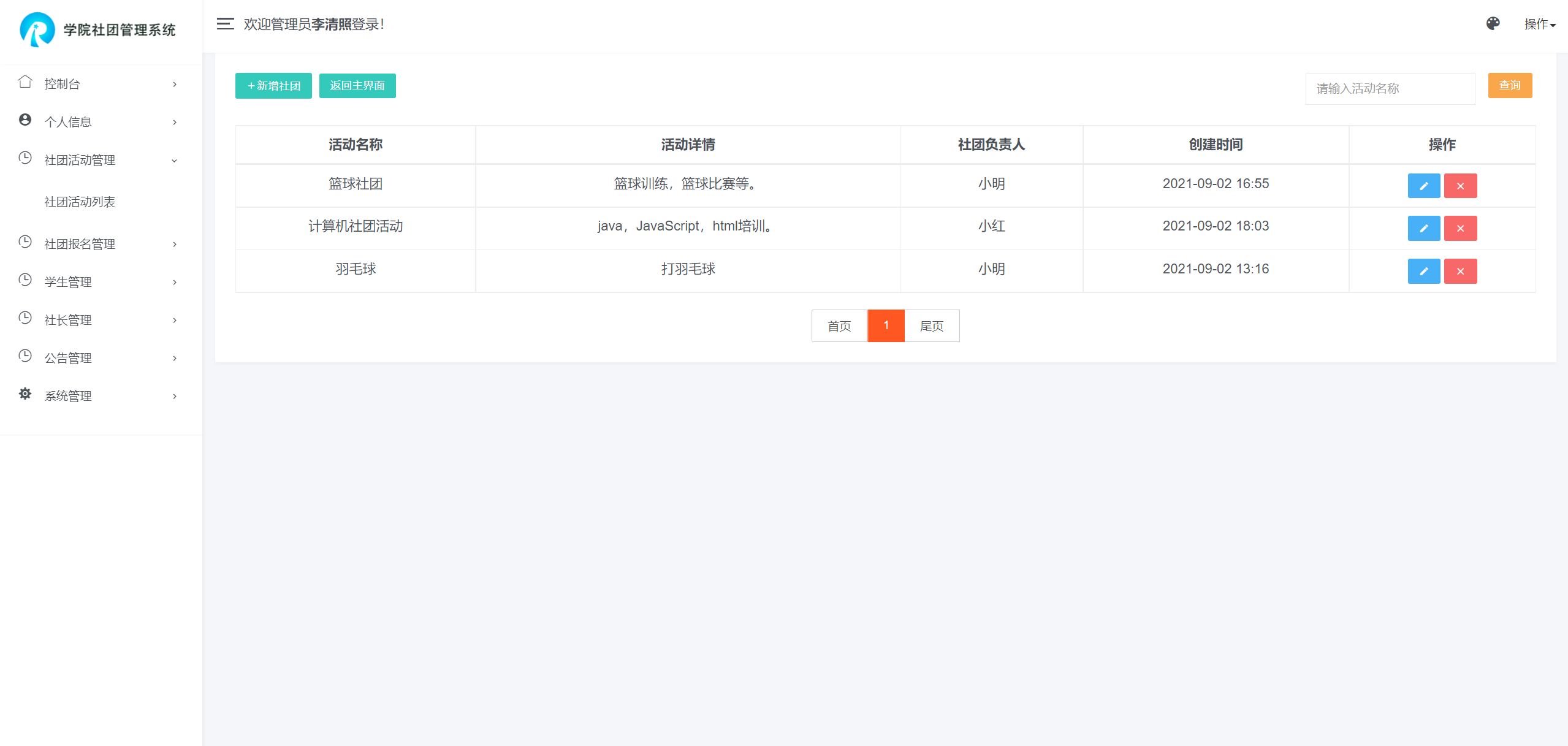管理员登录后可以对个人信息进行管理、学生管理、公告管理、社团活动管理、社团报名管理、社长管理等功能。