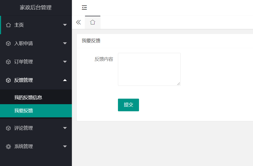 家政人员端主要有注册、登录、入职申请、订单管理、反馈管理、评论管理、以及系统管理等功能。