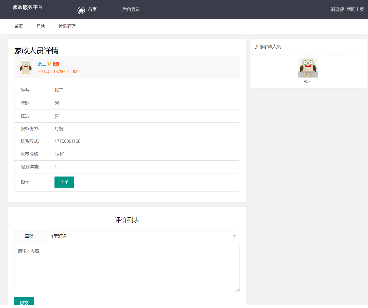 网站主要有首页、家政人员详情页等模块