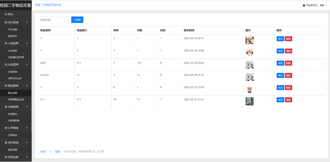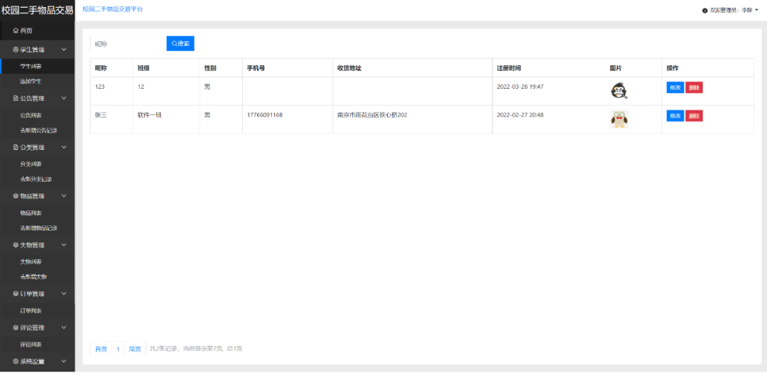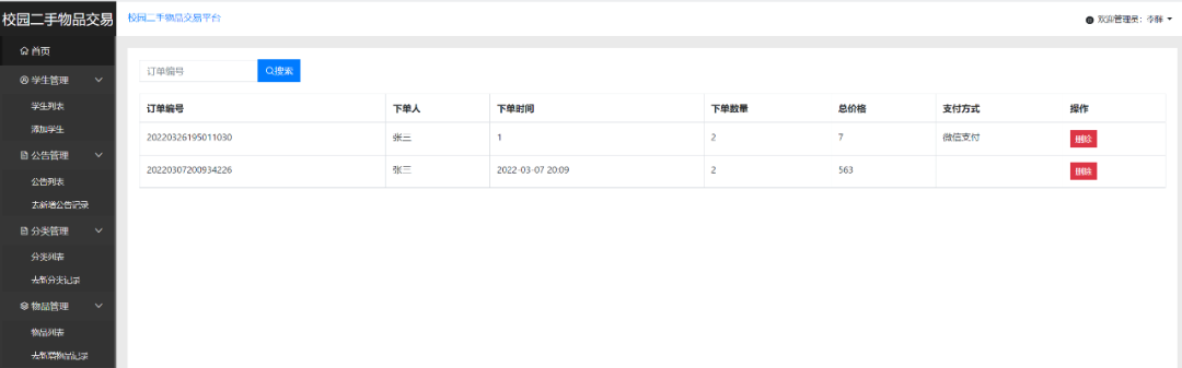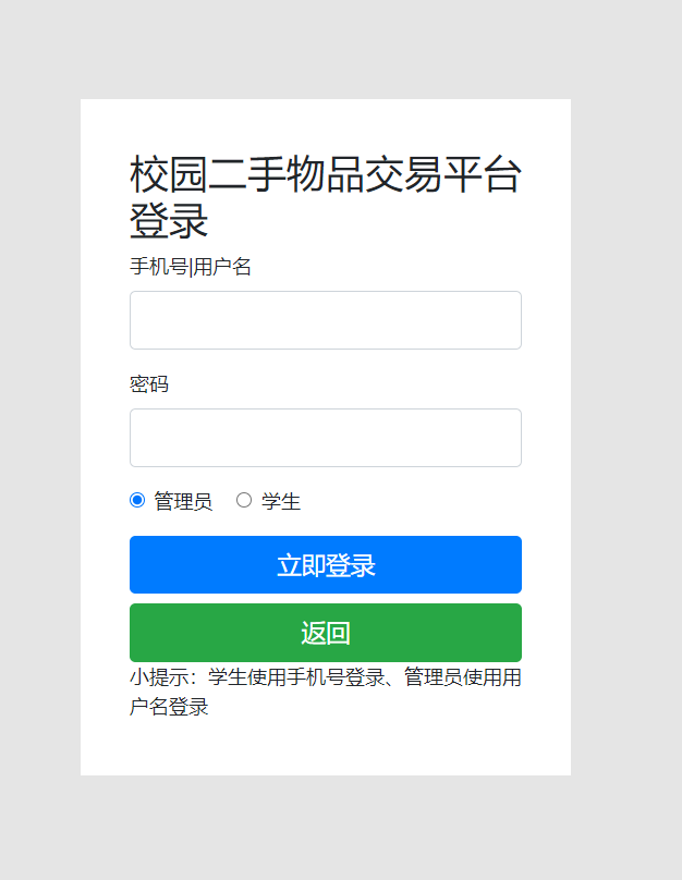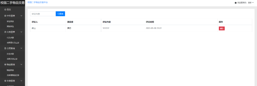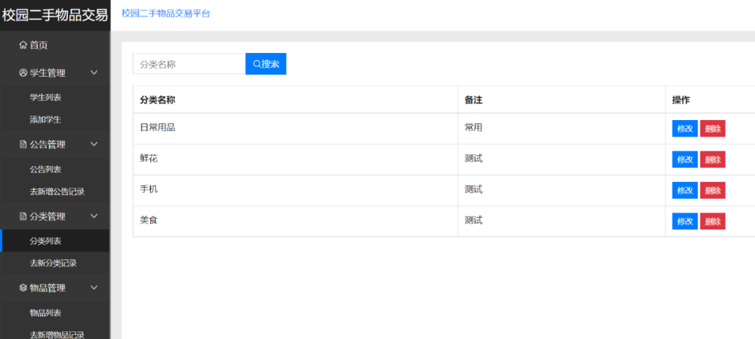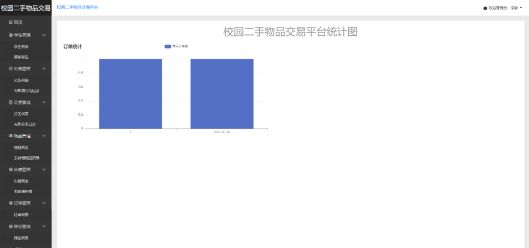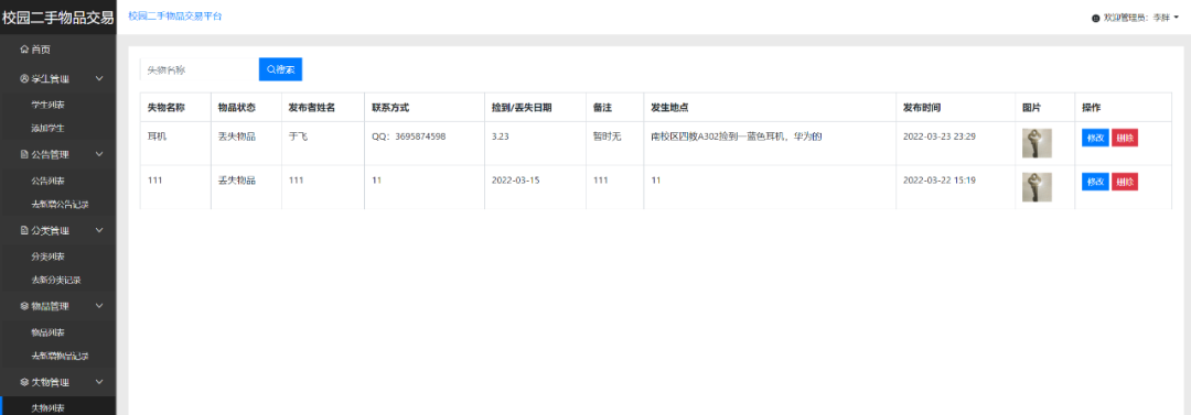 管理员端主要有登录、公告管理、类别管理、物品管理、失物管理、数据统计、学生管理、评论管理、订单管理等功能模块。