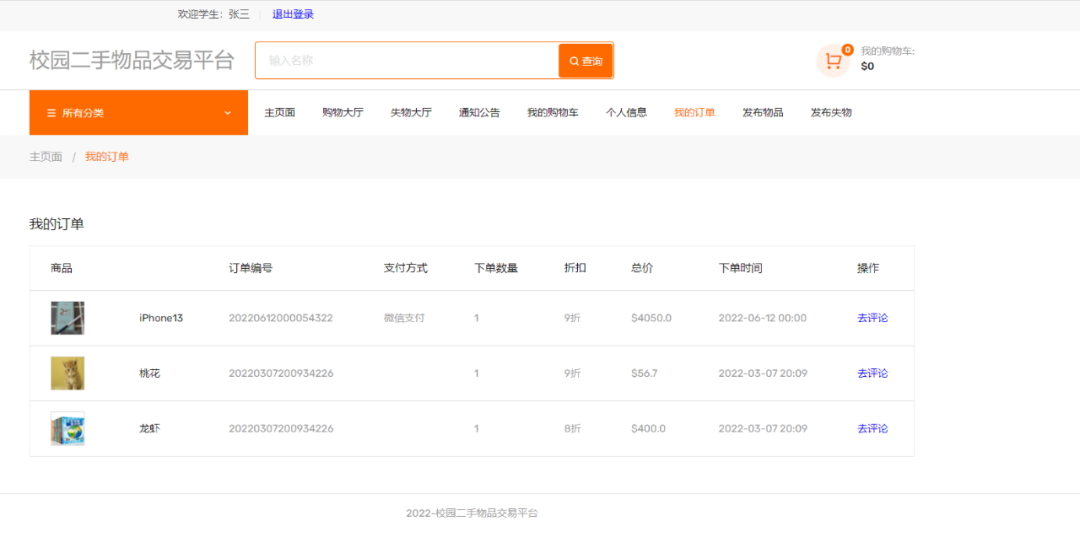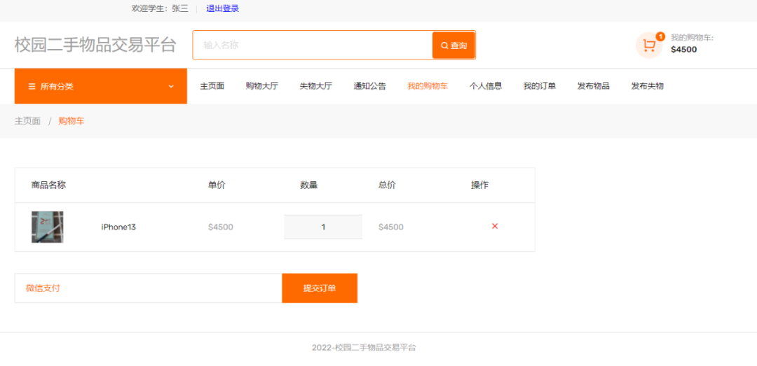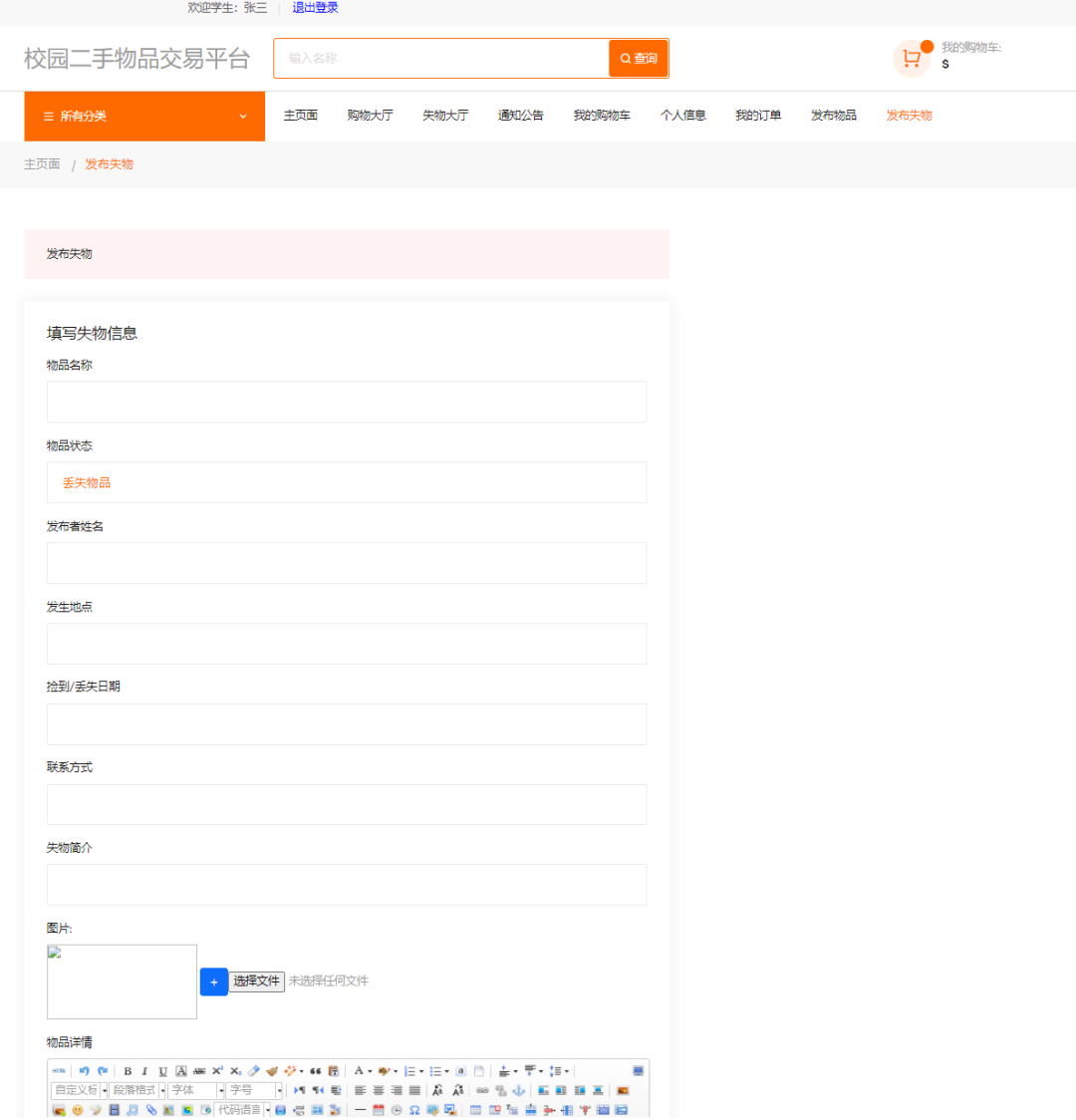 学生端主要有注册、登录、发布二手物品、发布丢失物品、购买二手物品、查看我的订单、进行评论二手物品、个人信息查看、修改等功能。