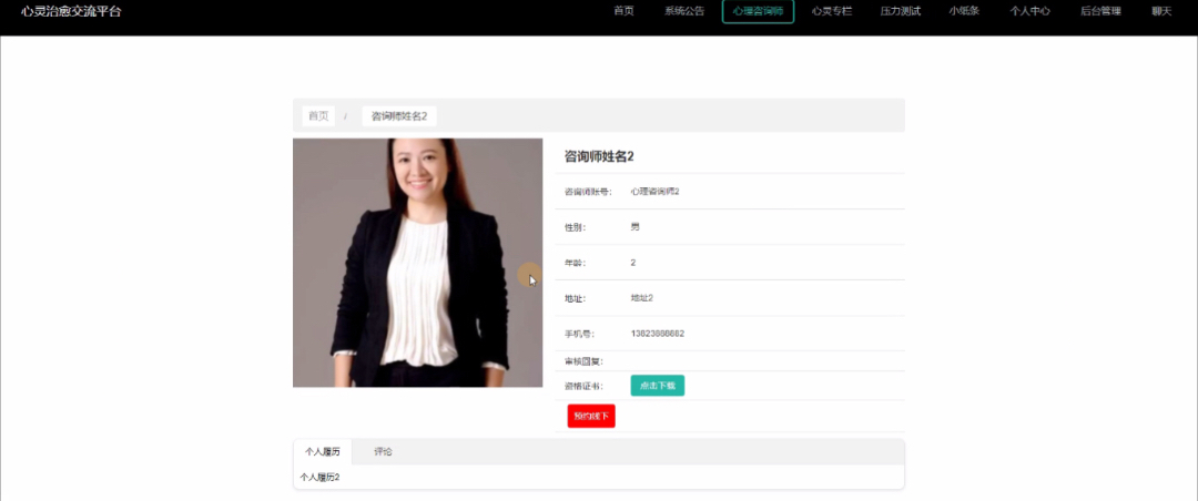 (3)心理咨询师:首页、个人中心、咨询师预约管理、系统管理等功能,心理咨询师