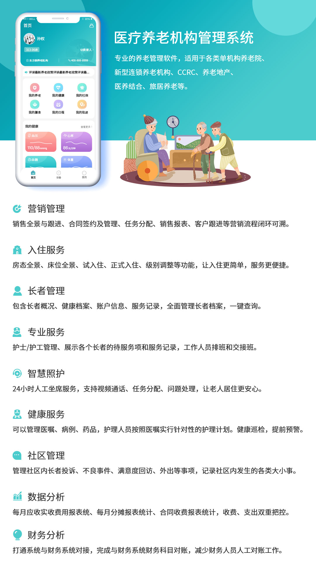 医疗保健养老养生机构管理系统saas版+双版本APP