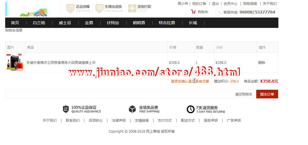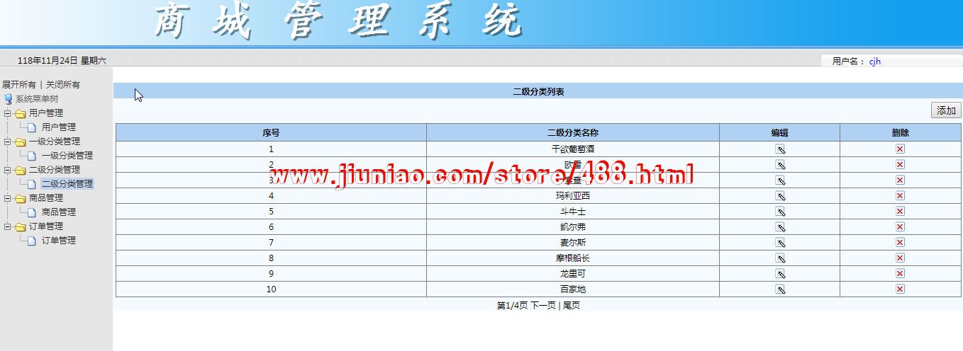 洋酒销售系统主要功能包括:前台用户登录退出、注册、在线购物、查看商品详情、后台商品管理等等。本系统结构如下: 前台模块 (1)首页: 显示最新商品及热门商品,商品的一级分类名称 (2)商品详情: 点击某个商品,可显示商品的详细信息 (3)商品分类展示:
