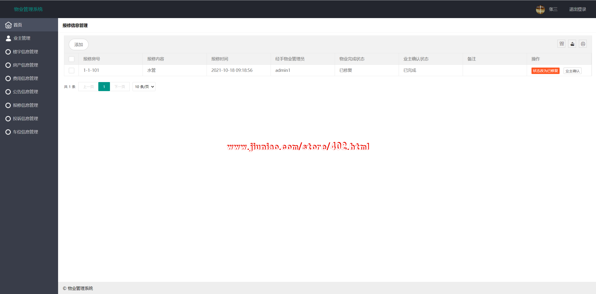 物业管理员物业端主要有登录、业主管理、楼宇信息管理、房产信息管理、费用信息管理、公告信息管理、报修信息管理、投诉信息管理、车位信息管理退出等功能。