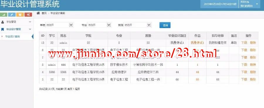 先进行登录,可以查看、下载、删除所有届所有专业所有班的毕业设计系统,可以通过系统,查看每届(17 18 19)、每个专业()、每个班级()下的毕业设计系统,可以查看、下载毕业设计压缩包,(下载全部 放在一个文件夹)可以通过关键字进行搜索符合条件的毕业设计系统。可以管理学生的信息,对其进行增删查改。