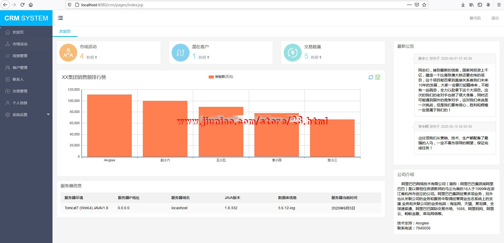 该项目未使用spring框架,实现了用户登录,权限控制,数据统计,以及市场活动、线索、客户、联系人、合同的CRUD,使用Proxy实现Service层的动态代理,实现DAO层事务控制,有助于深入理解web项目