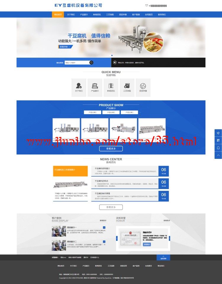 基于ThinkPHP5开发的一款豆腐机工业机械设备企业网站模板,是一款适用于工业、机械、豆腐机、设备等行业的通用企业网站模板,原创设计、手工书写DIV+CSS,完美兼容主流浏览器;结构容易优化;多终端均可正常预览。