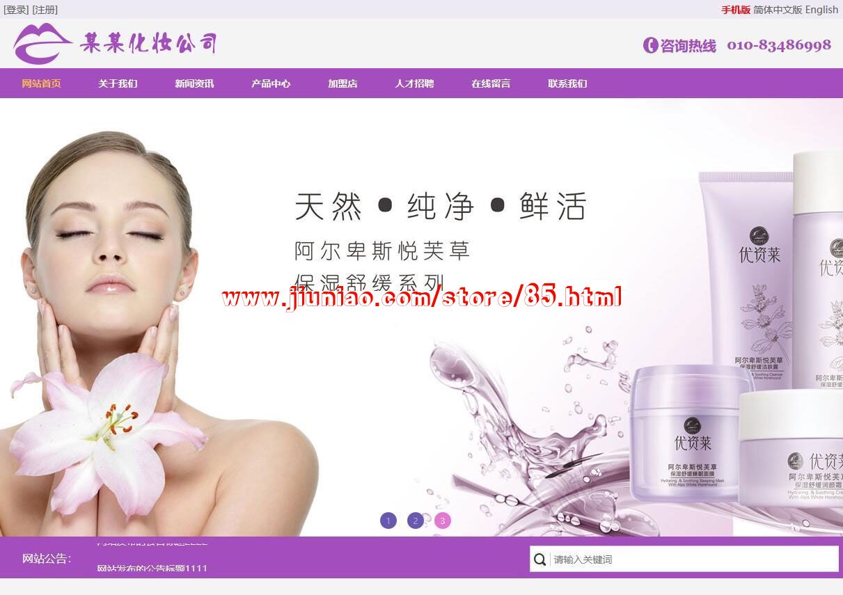 模块有关于我们、新闻资讯、产品中心、加盟店、人才招聘、在线留言、联系我们