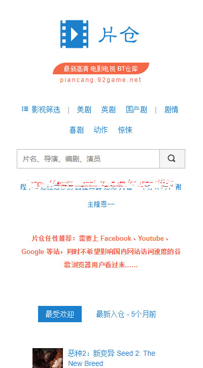 片仓网专注电影站搜索引擎,所有bt种子均由计算机程序从第三方平台抓取过来,海量电影资源可根据片名、导演、编剧、演员快速搜索,片仓网不是bt种子制作者、所有者、提供者,也不存储任何影音等资源文件,大大减轻服务器压力和存储空间