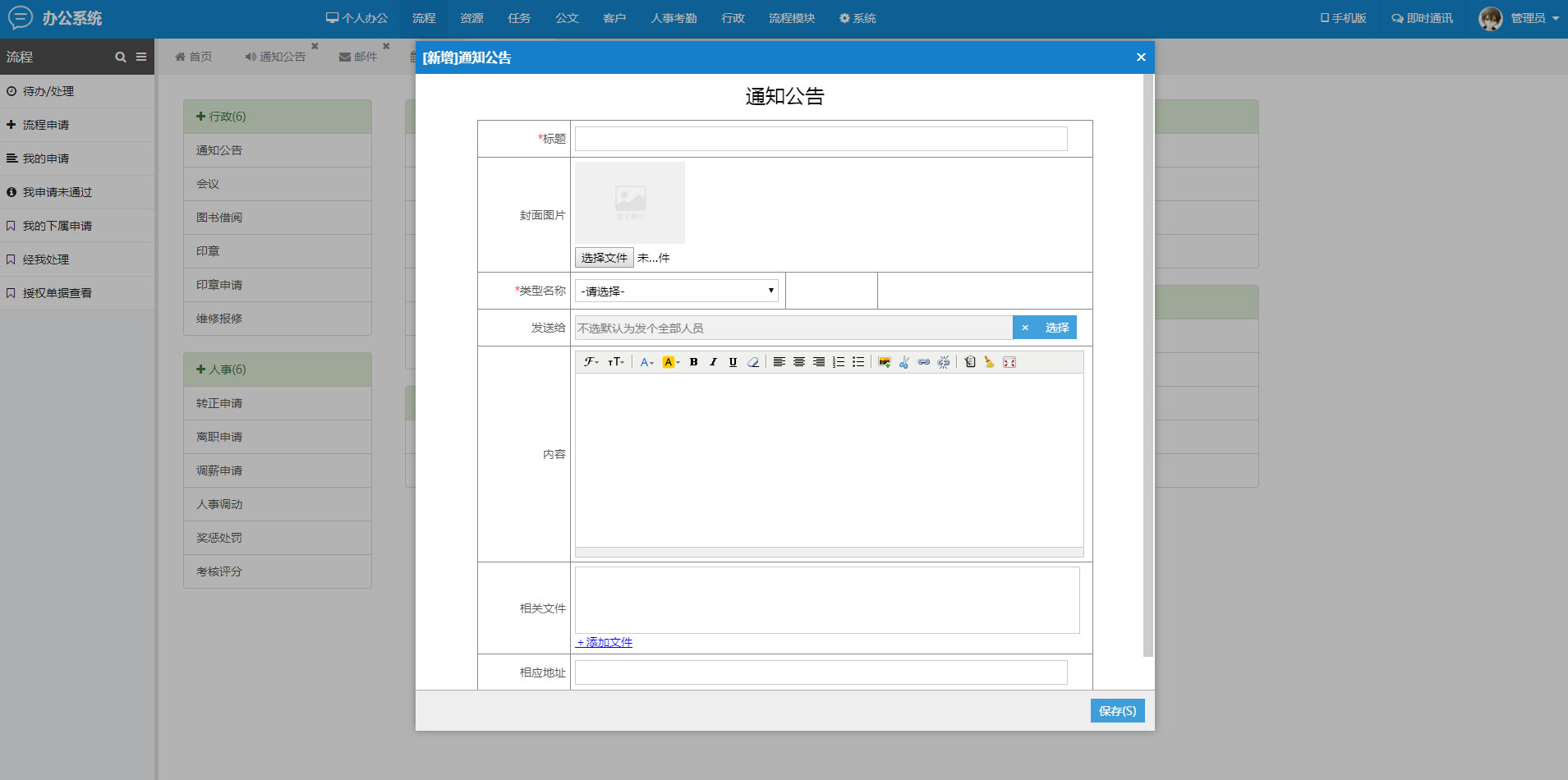 系统含个人办公、流程、资源、任务、公文、客户、人事考勤、行政等模块