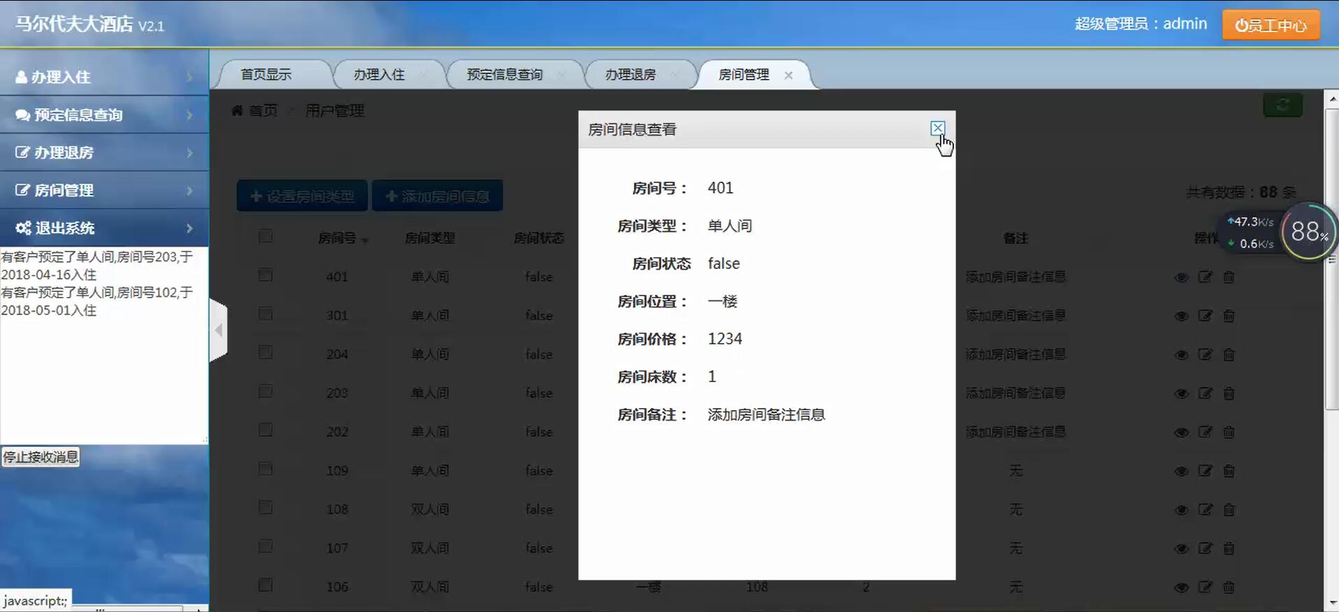 主要功能:系统登录、办理入住、房间管理、预定消息提醒、用户管理、退出系统