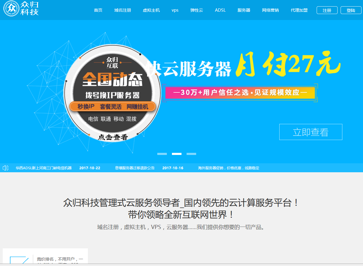 这是 一个首创聚合IDC平台,需要API授权后就可以拥有一个独立的IDC销售平台。我们代理众多加入要趁早哦众归科技(互联)是国内首家聚合类品牌IDC主机一站式整合选购平台!整合品牌众多:景安云、阿里云、百度云、腾讯云、至尊云、中网科技、橙云、息壤、华云、西普、电联通信、品牌宝、可信认证等等。。还有更多只需加盟众归科技这一个平台,就可以拥有所有的最优代理权及IDC代理平台。 众归科技:物美价廉、品牌产品众多、一站选购方便快捷、促销活动惊喜不断…… 代理限时免费提供IDC主机代理销售平台,功能强大,让你选择更多更广更自由。
