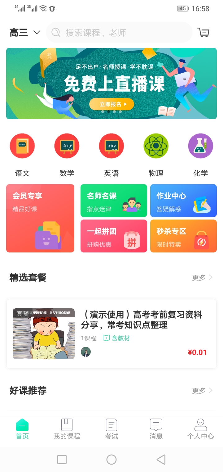 学生可在此终端参与直播授课,内含课程购买、在线考试、作业本、错题本、推广中心等板块。