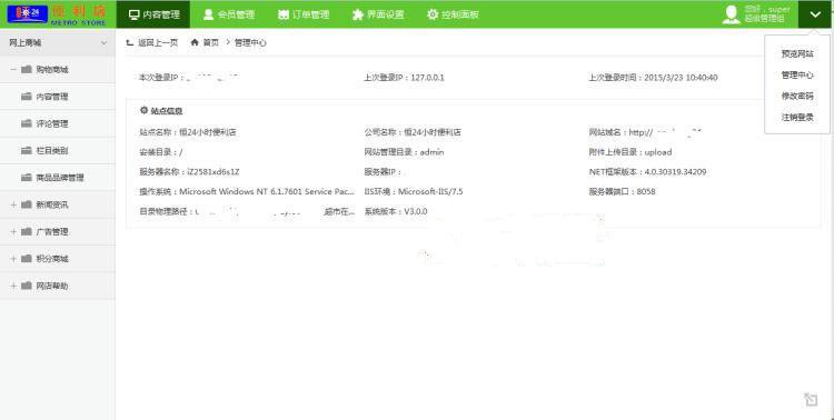 1、内容管理:购物商城;内容管理;评论管理;栏目类别;商品品牌管理;新闻咨询;广告管理;积分商城;网店帮助