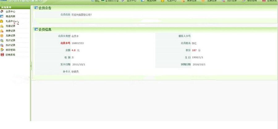 4、统计报表:充值明细报表、收入明细报表、消费明细报表、积分明细报表、出库入库报表、会员信息报表、积分排行报表、利润统计报表、商品销售统计。