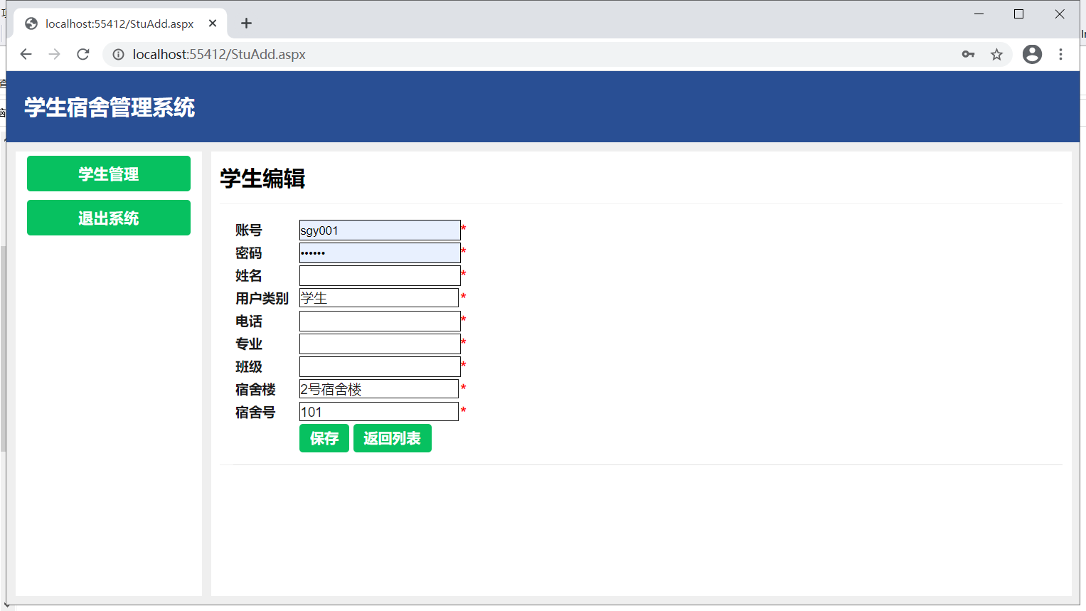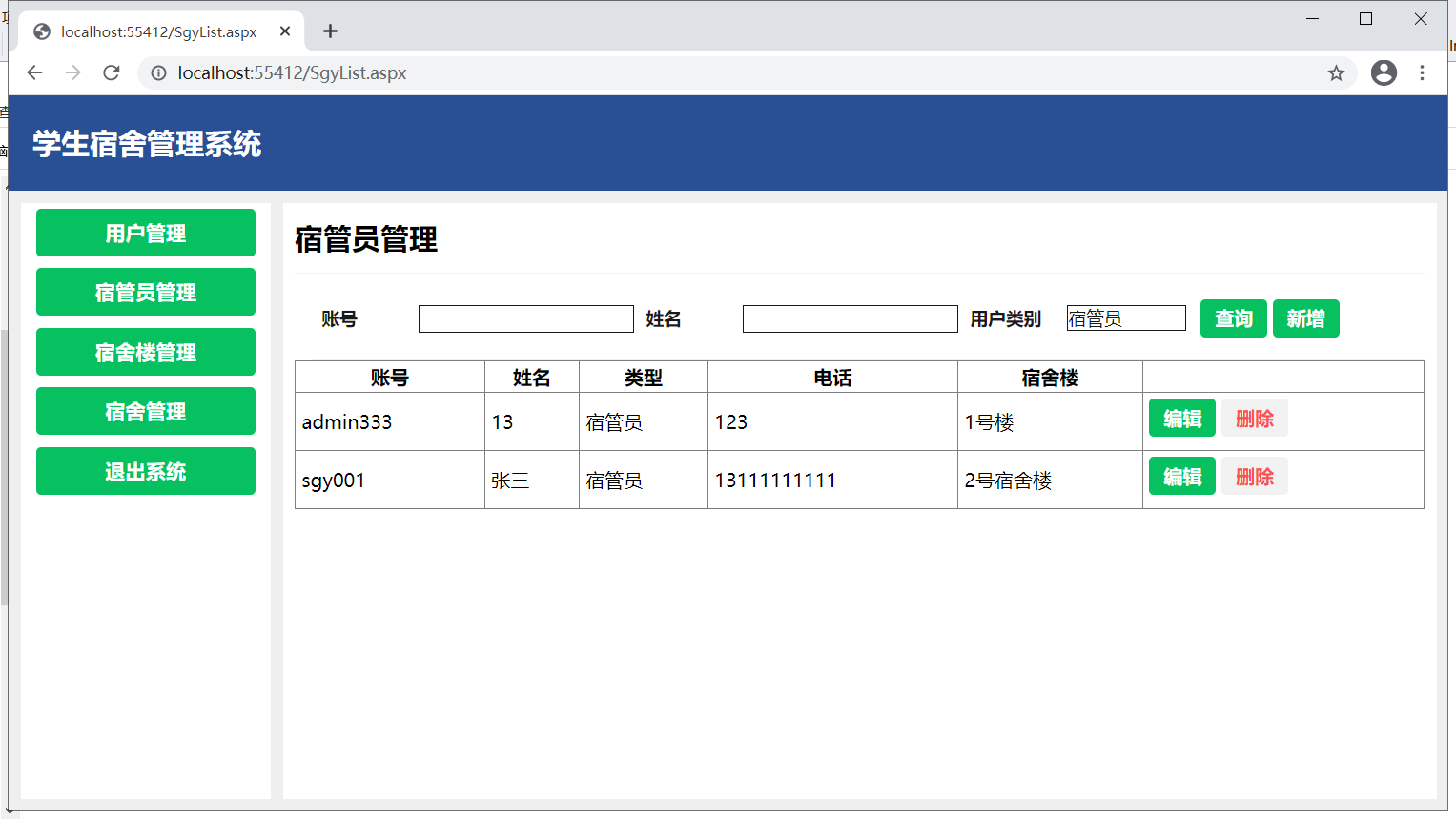 本系统采用asp.net技术开发,主要开发工具有visual studio(最低支持2010)及数据库sql server(最低支持2008)。系统包含三种权限,分别是:管理员、宿管员、学生管理员拥有登录、宿管员信息的增删改查、宿舍楼信息的增删改查、宿舍信息的增删改查等功能。宿管员拥有登录、学生入住、学生信息修改、学生删除等功能学生拥有登录、本宿舍人员信息查看等功能。