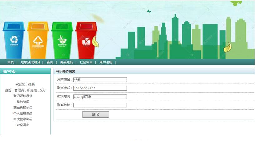 登记信息管理是对普通用户和会员用户的垃圾袋领取信息进行查看,方便进行邮寄垃圾袋。