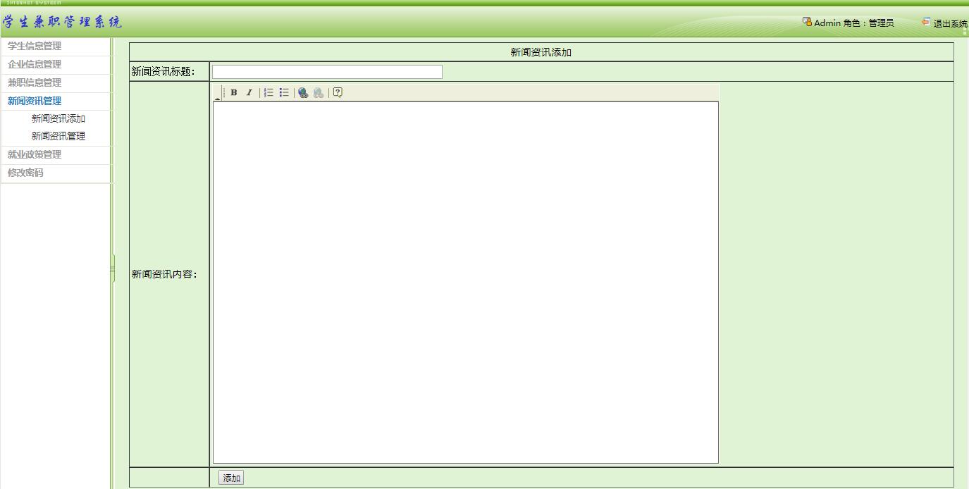 (1)系统管理员主要是对基础信息的维护、管理以及审核操作,包括对学生信息的管理,企业用户信息的管理、企业发布的兼职信息的审核,以及发布有关兼职的新闻资讯和就业政策。