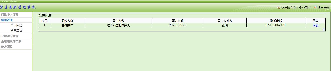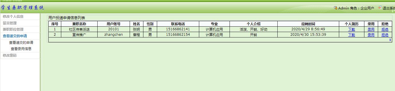 (3)学生用户主要是注册基本信息,然后登陆后可以浏览并投简历给兼职信息,企业能看到学生投递的简历,学生可以在线搜索兼职信息。在兼职投递过程中可以给企业进行留言。