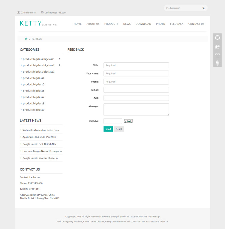 3.产品模块:产品支持二级分类,并可对产品直接下订单询价,且支持邮件通知,更符合企业营销。