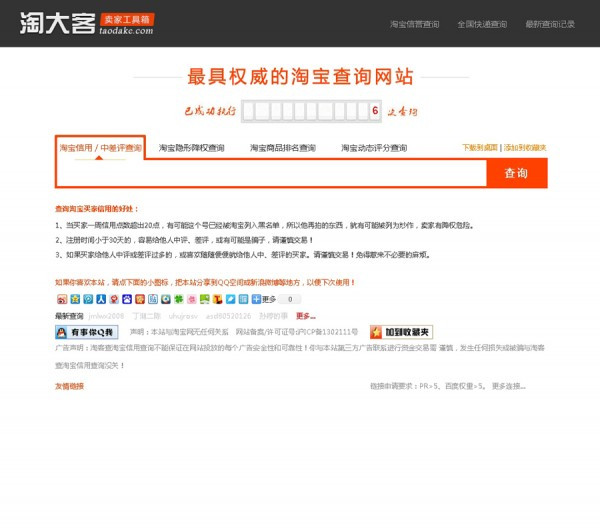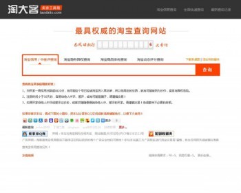 本源码为淘宝信誉查询网站源码,也叫淘宝工具箱,是各种淘宝业务平台用于查询小号信用,认证情况等必备的工具。也用于淘宝卖家查询买家信用,给其他卖家的评价情况,判断是否是差评师,是否是淘宝黑账户等等。