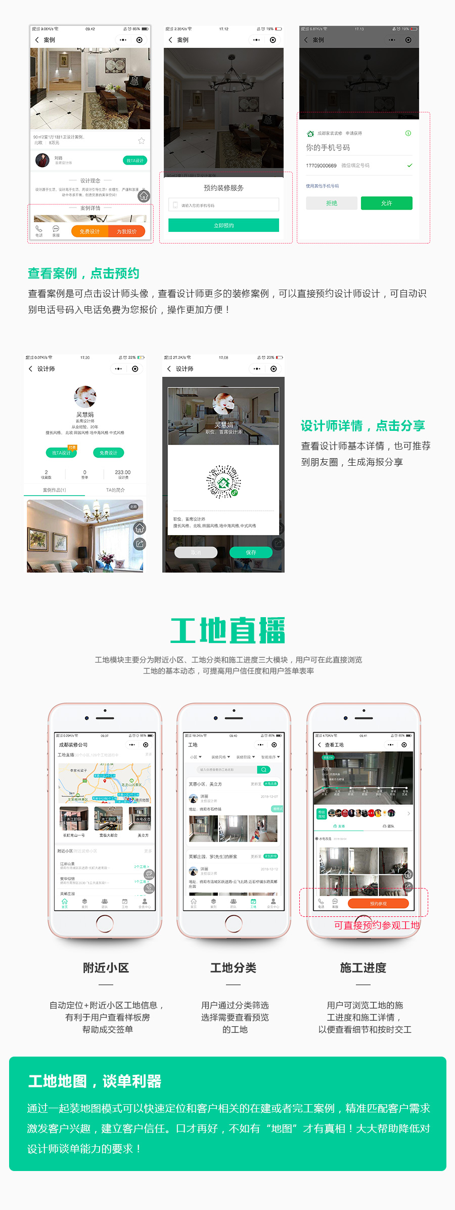 3:工地直播(工地搜索、施工进度、围观粉丝)、团队介绍(设计师简介、预约、一键报价)、案例展示(支持小区、风格、筛选、案例设计师作品关联)、VR全景展示、附近小区等