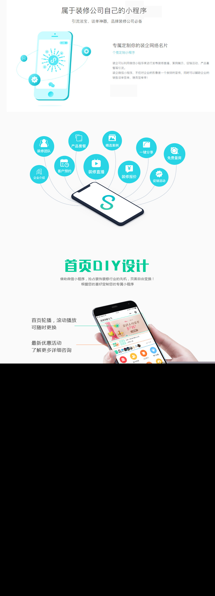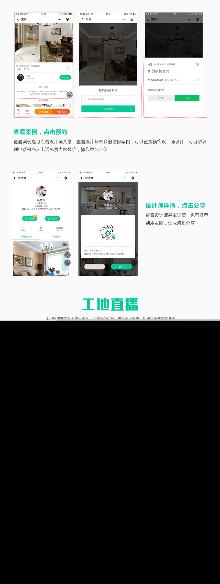 3:工地直播(工地搜索、施工进度、围观粉丝)、团队介绍(设计师简介、预约、一键报价)、案例展示(支持小区、风格、筛选、案例设计师作品关联)、VR全景展示、附近小区等