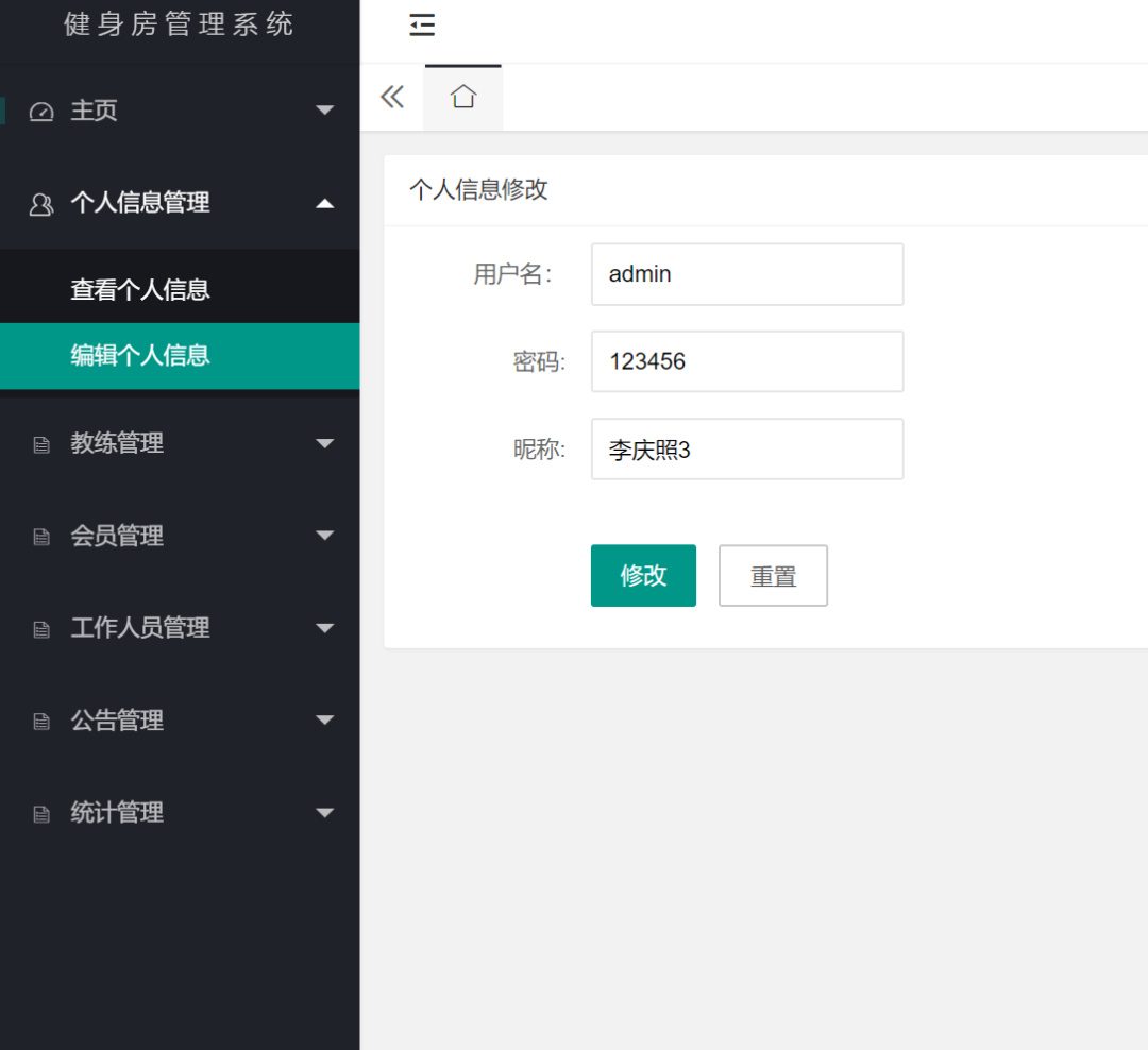管理员登录后可以对个人信息进行管理、工作人员管理、教练管理、会员管理、公告管理、统计管理等功能模块。