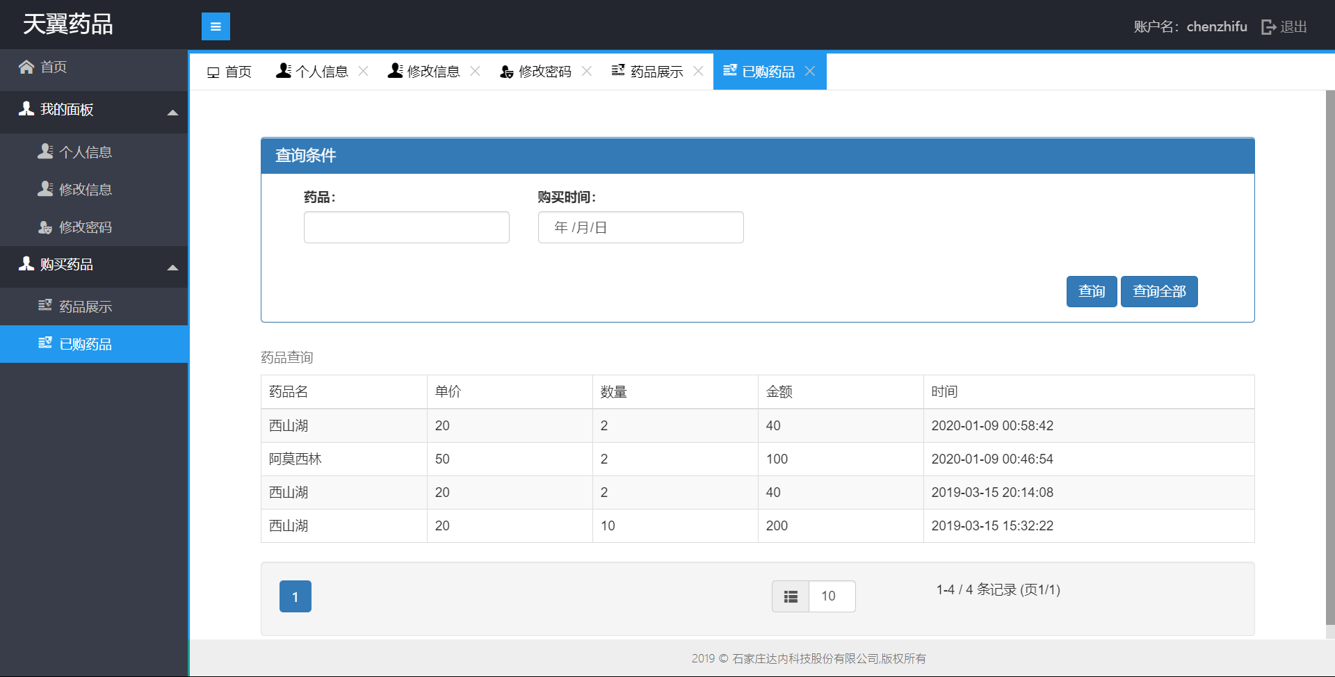 SpringBoot+layui+mybatis 环境: jdk1.8+mysql5.7(或者8)+maven3.x 功能说明: 客户: 我的面板:个人信息、修改信息和修改密码 药品管理:药品展示和已购药品 员工: 我的面板:个人信息、修改信息、修改密码 药品管理:药品类别添加、药品类别查询、药品添加和药品查询 客户管理:客户查询、供货商管理(供货商添加、供货商查询) 账单管理:进货添加、进货查询、退货账单和销售账单查询 交易方式:线上交易