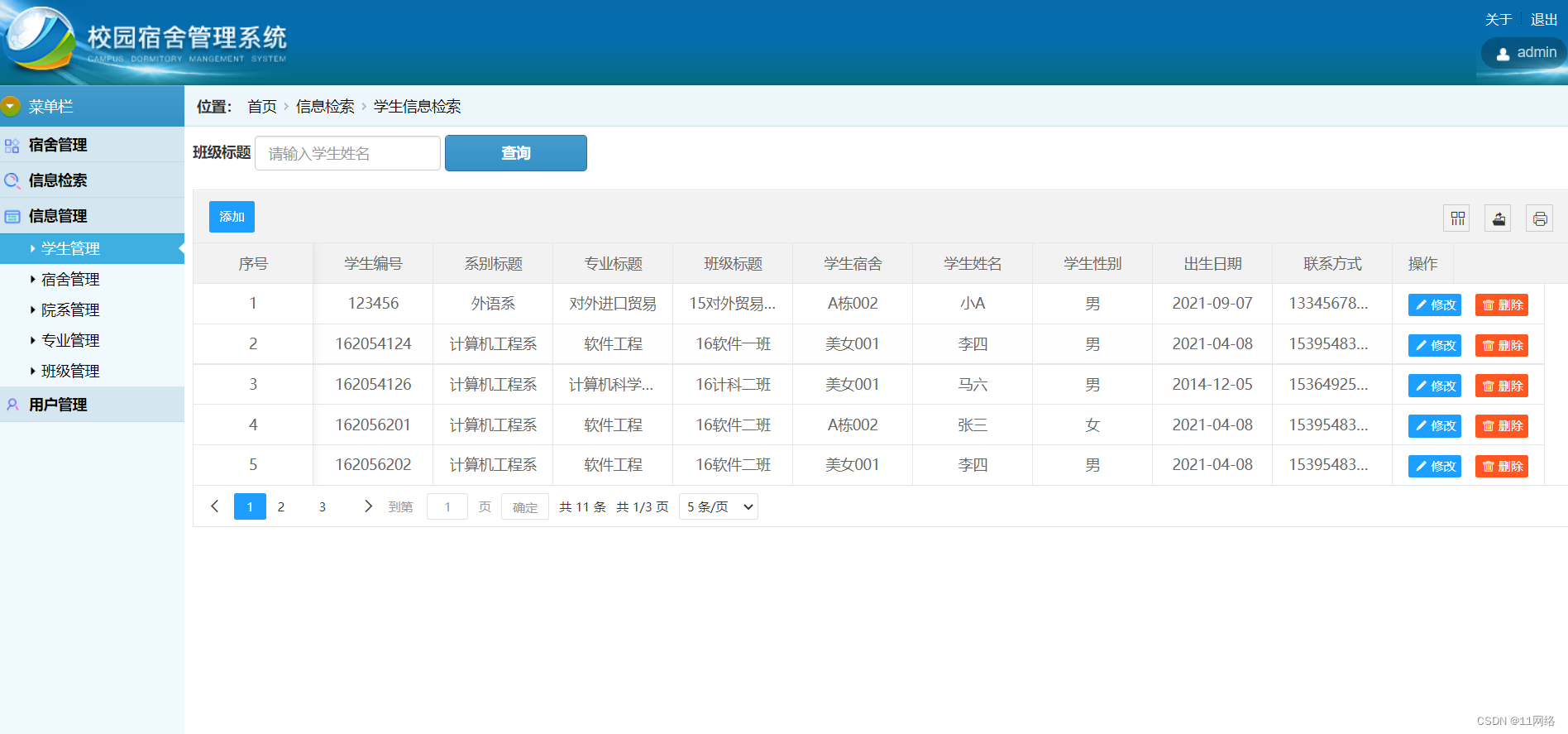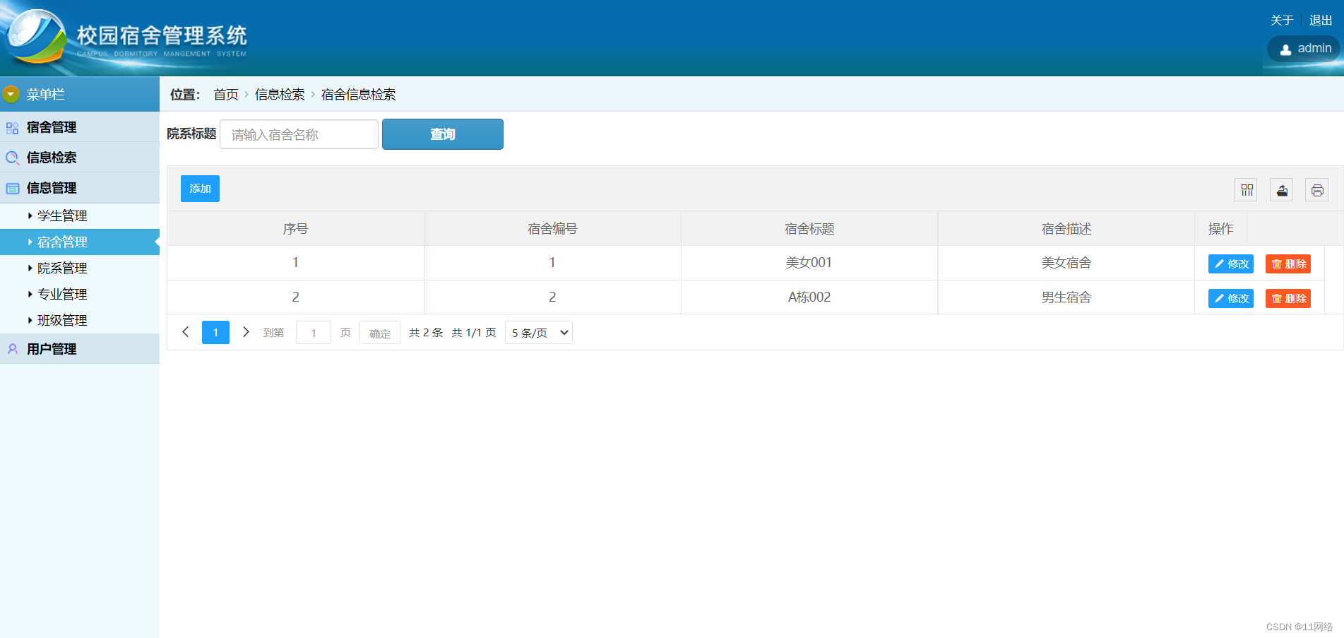 用户信息管理、学生管理、院系管理、专业信息管理、班级信息管理、宿舍信息管理等等