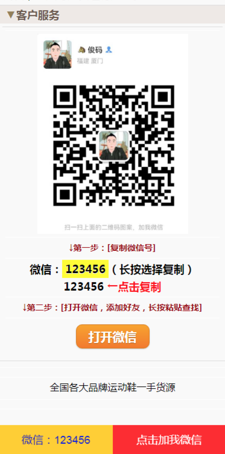 用来推广有很好的效果,支持点击复制微信号,支持一键拉起微信,对用户来说非常方便。源码可随意修改,这个是莆田鞋,你也可以随意更改成你的任何产品,从图片到文字都支持自定义修改,修改完直接上传即用,方便快捷。这个是html单页面源码无后台的,上传网站根目录即可使用!