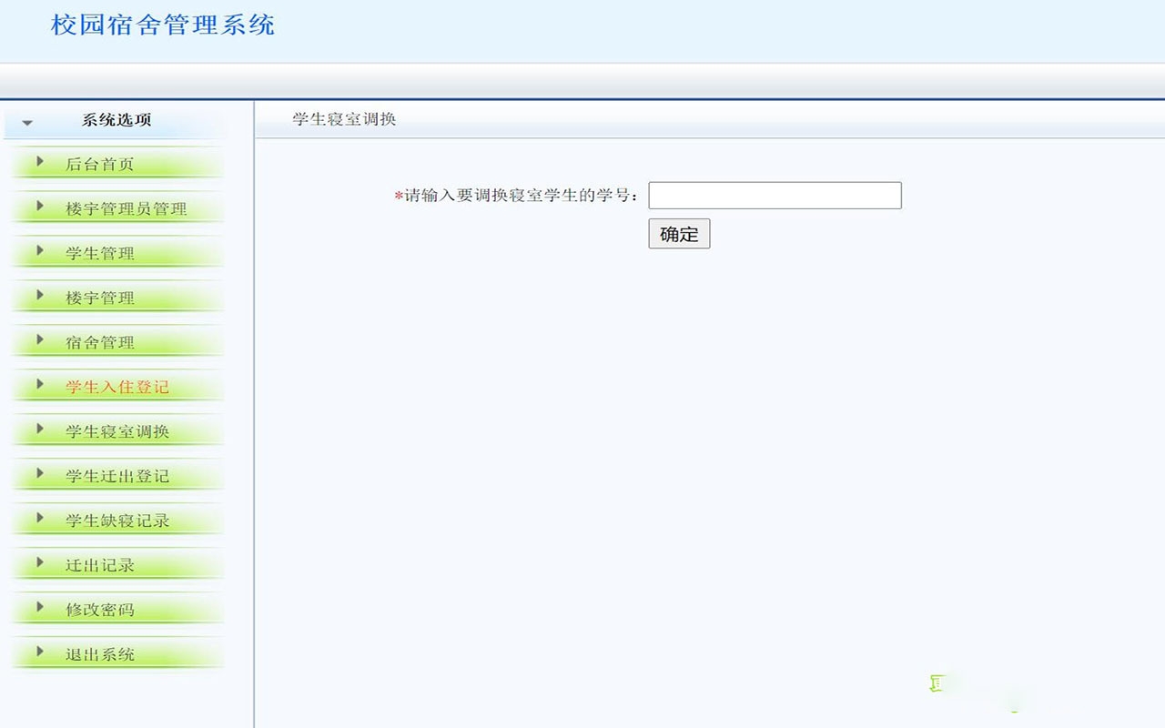 系统分为三个角色,主要有管理员,宿管和学生,管理员的主要功能有:宿管和学生管理,宿舍楼管理,宿舍管理,学生入住登记,学生宿舍调换,学生迁出登记,缺寝记录等,学生可以查看自己的缺寝记录,宿管可以管理学生和登记学生的缺寝记录