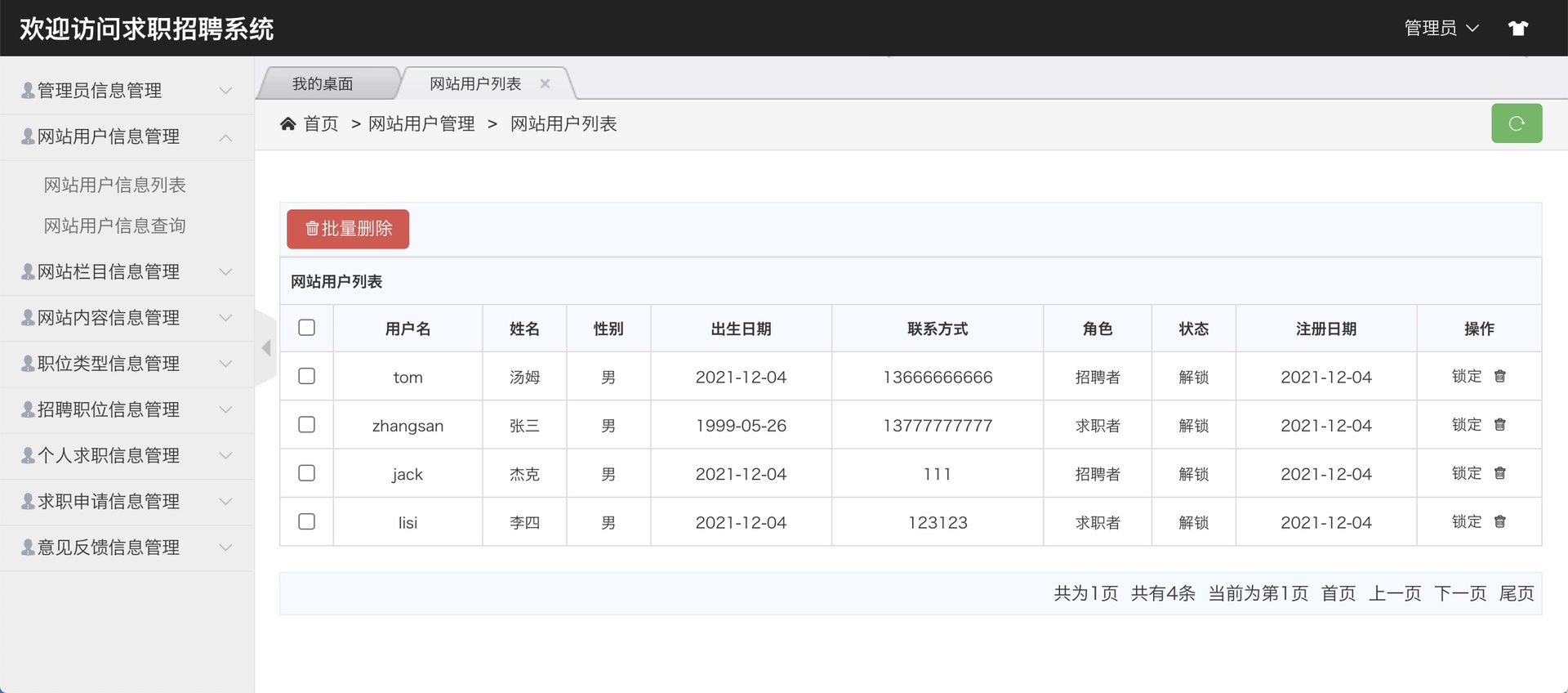 系统后台登陆、管理员管理、用户管理、新闻公告管理、职位类型管理、招聘职位管理、个人求职管理、求职申请管理、意见反馈管理等功能。