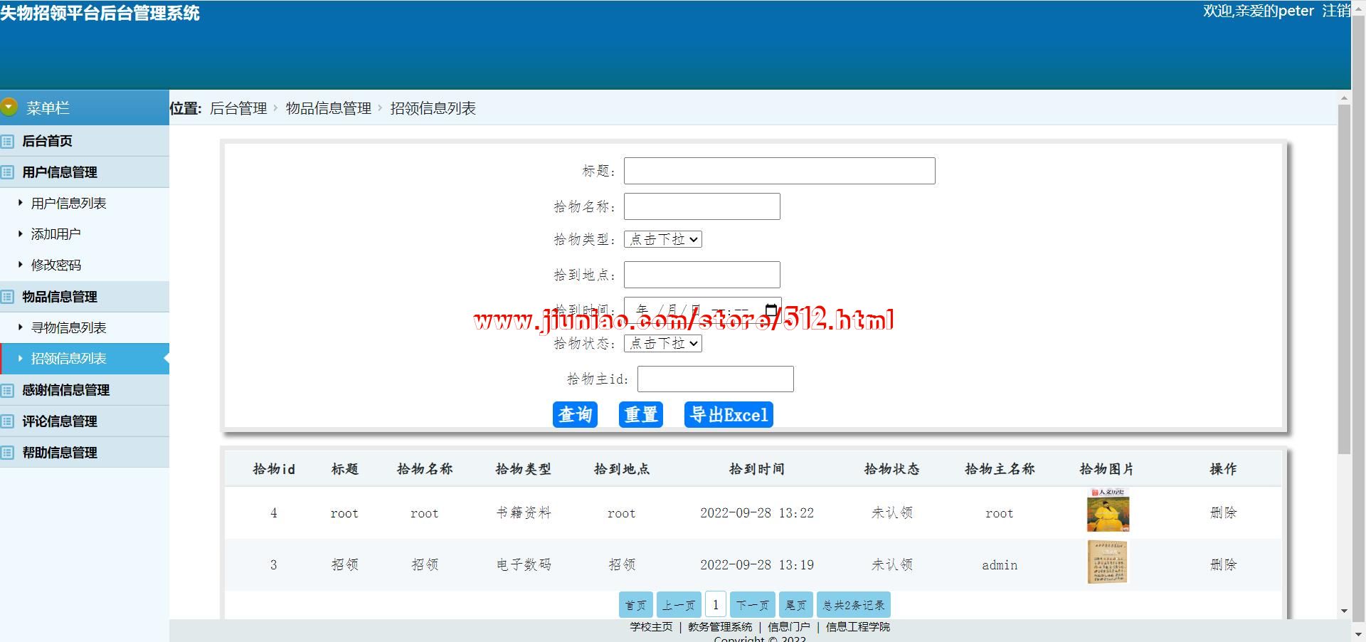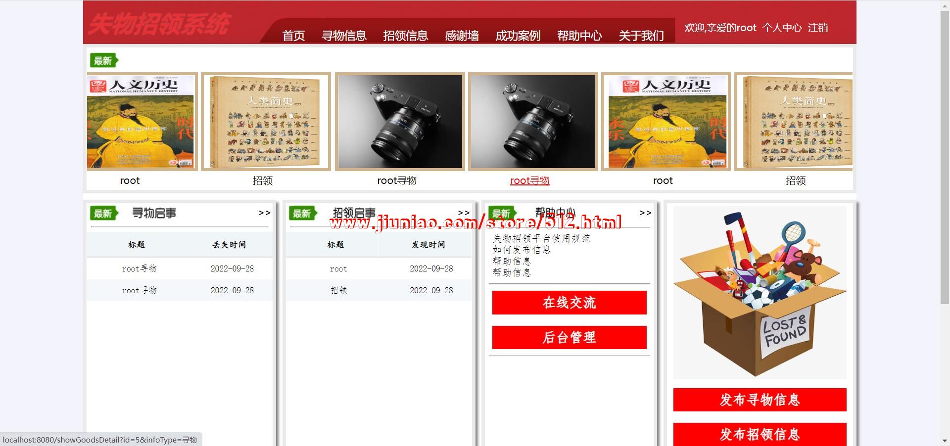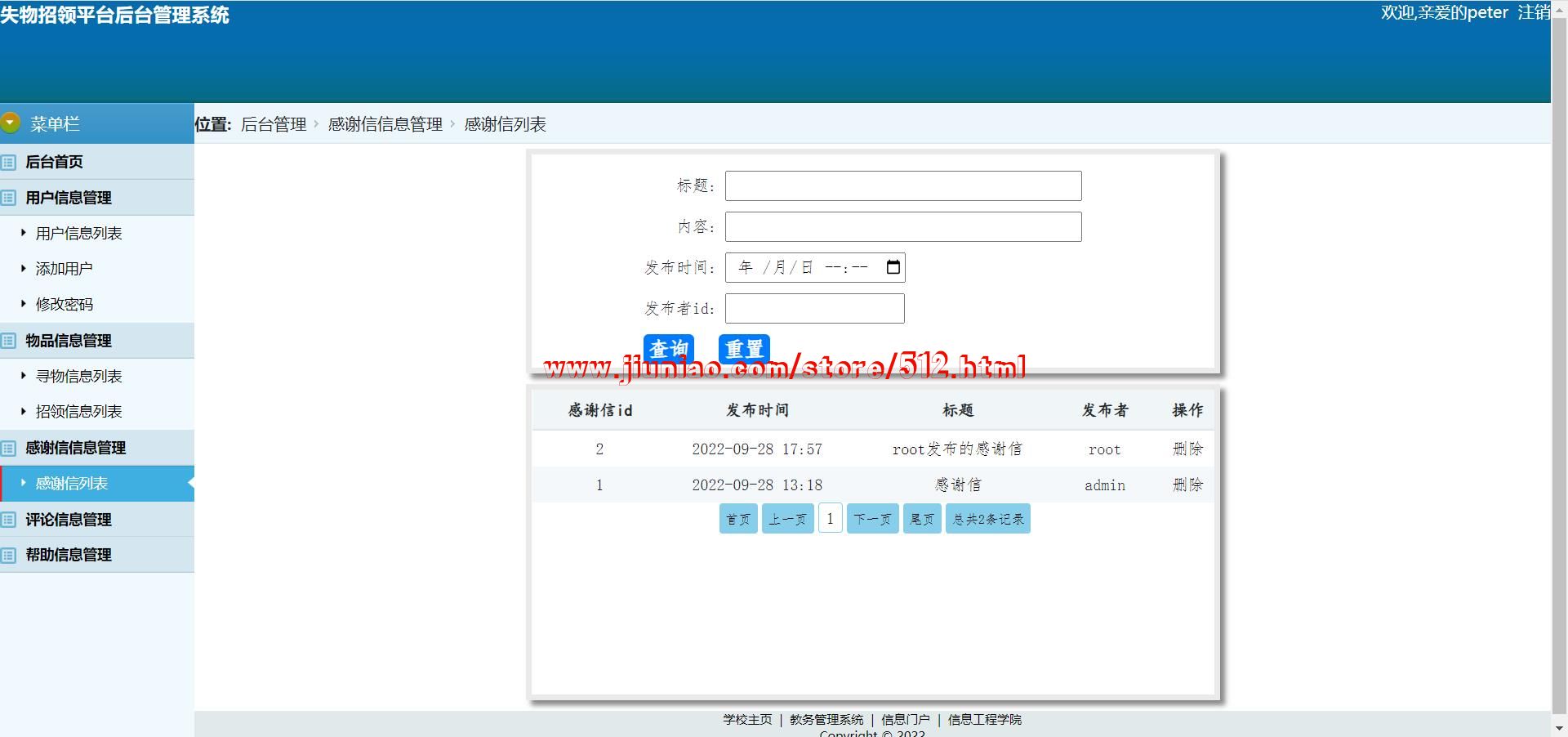 管理员:用户信息列表(查询用户、编辑用户信息、删除用户信息)、添加用户、修改密码、寻物信息列表(查询寻物信息、删除寻物信息、取消已找到物品)、招领信息列表(查询招领信息、删除招领信息、取消认领)、感谢信列表(查询感谢信、删除感谢信、查看感谢信具体内容)、评论列表(查询评论、删除评论、查看评论内容)、帮助信息列表(编辑帮助信息、删除帮助信息)、添加帮助信息;