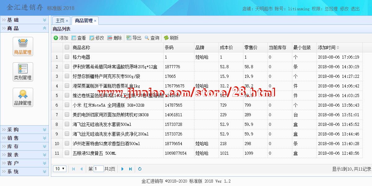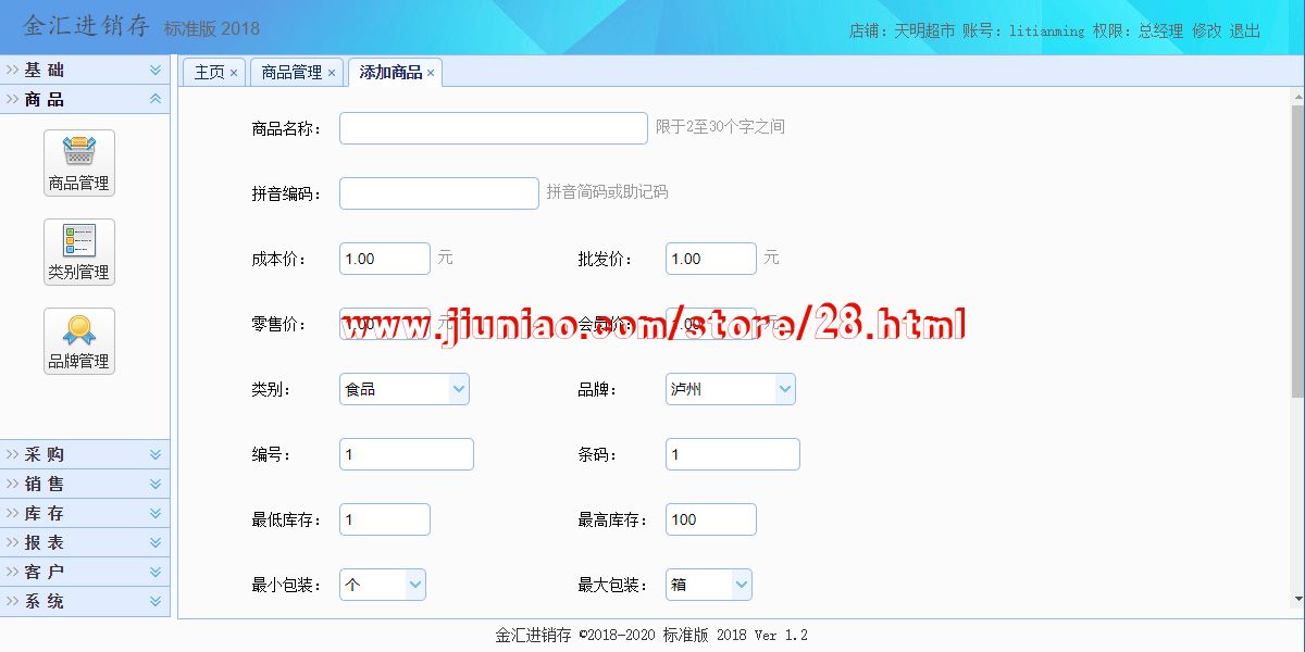 包含商品管理、采购、销售、库存、客户、报表等模块。