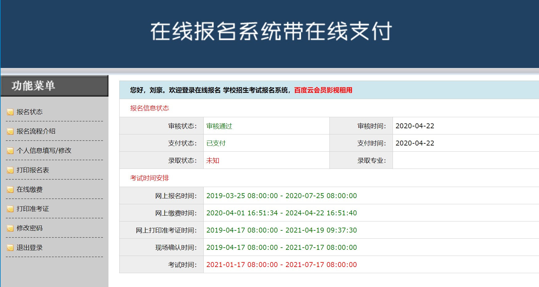 "这是一套简单好用功能强大的在线报名招生考试系统,涵盖注册、审核、报名、在线支付,打印报名表,打印准考证,导出报名表的一系列完整的功能 。