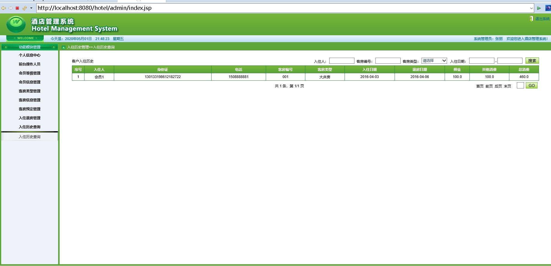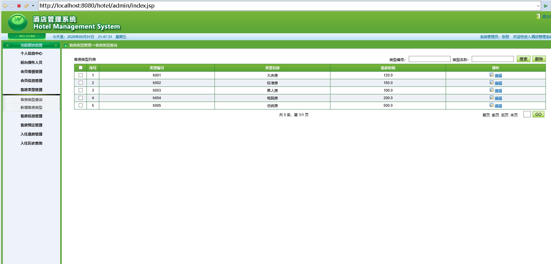 java+servlet+mysql绿色界面酒店管理系统源码