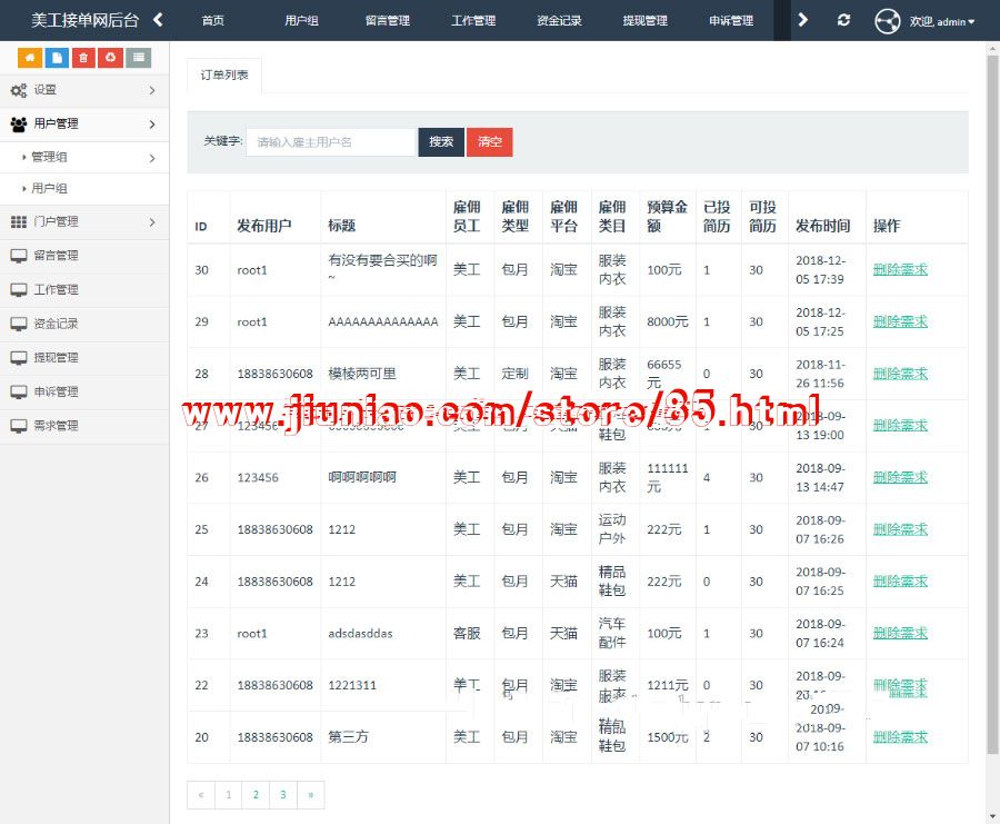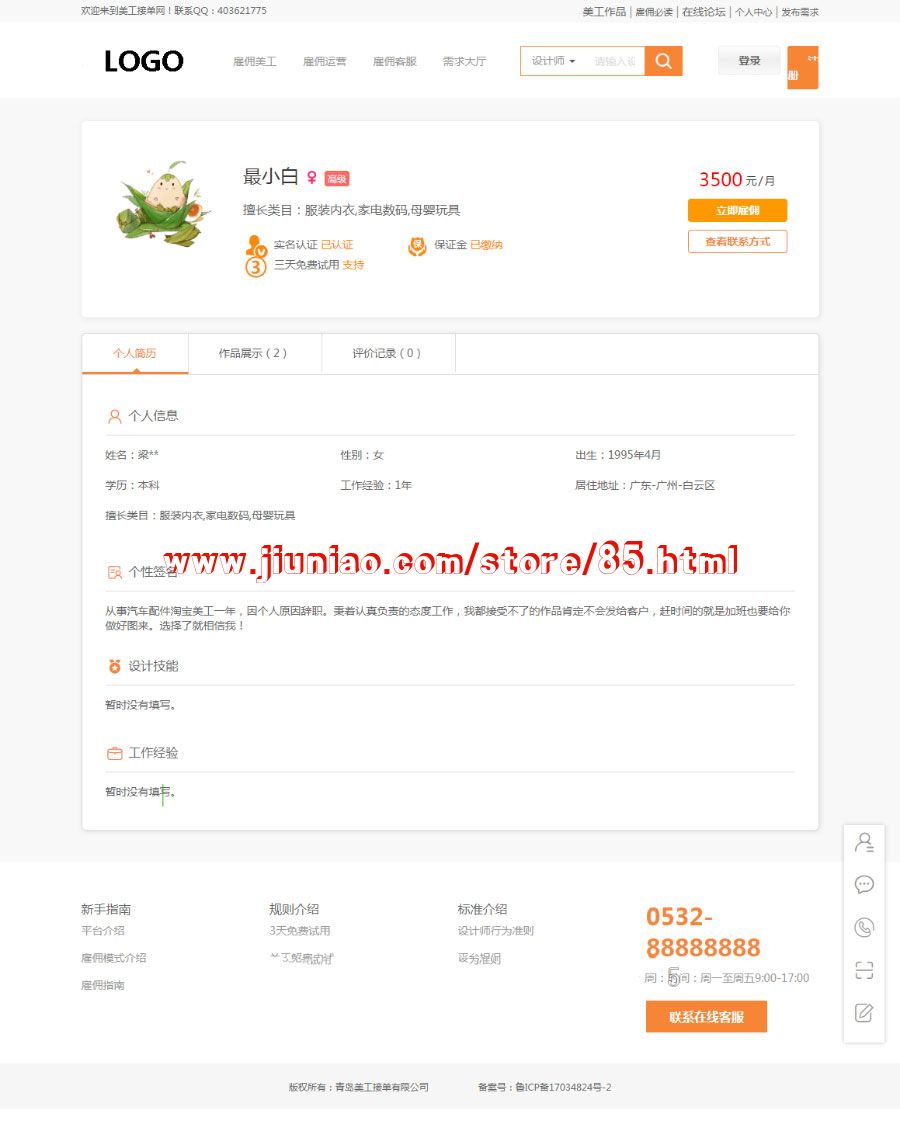 美工/客服/运营在线雇佣平台源码,美工/客服/运营在线接单,在线工作,有考勤管理,工作管理,请假管理,暂停管理等功能,可定制雇佣美工/客服/运营,可包月雇佣美工/客服/运营全职工作,也可发布需求美工投递简历。