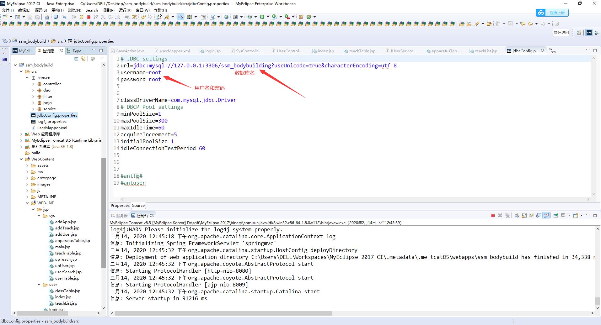 导入项目到myeclise 修改配置文件数据库连接配置 jdbcConfig.properties 然后启动tomcat服务