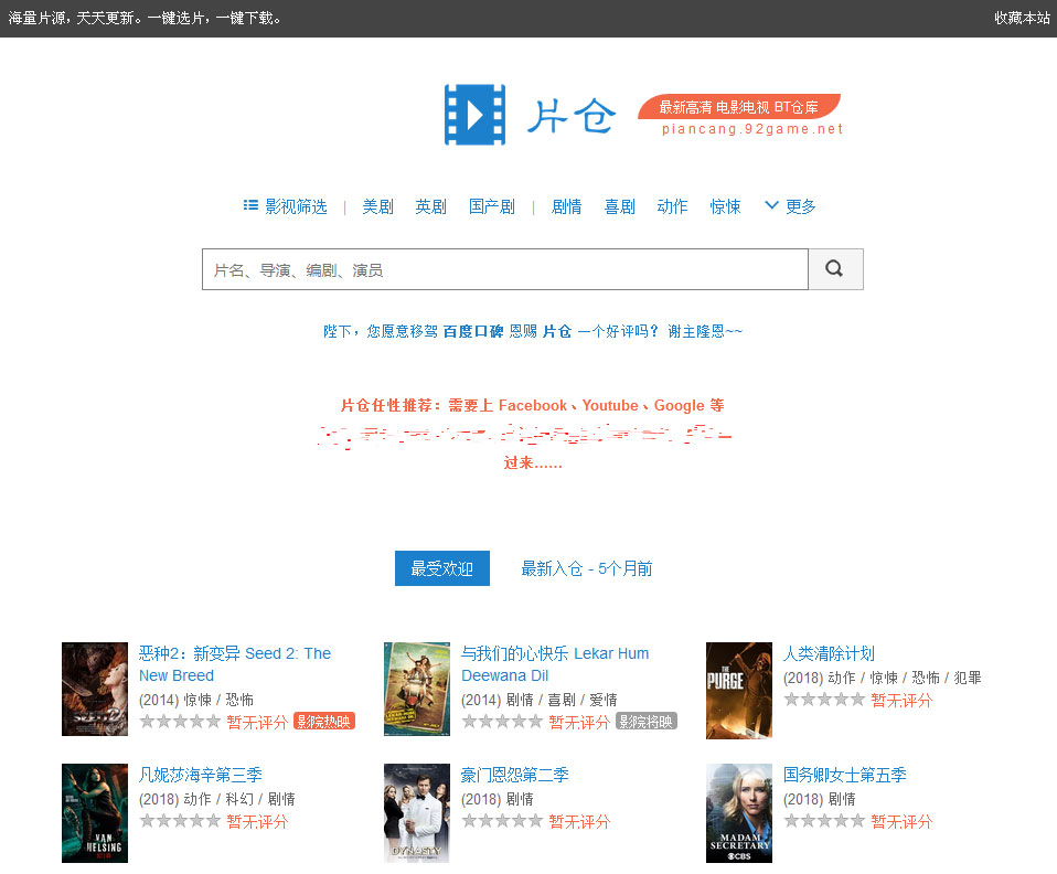 片仓网专注电影站搜索引擎,所有bt种子均由计算机程序从第三方平台抓取过来,海量电影资源可根据片名、导演、编剧、演员快速搜索,片仓网不是bt种子制作者、所有者、提供者,也不存储任何影音等资源文件,大大减轻服务器压力和存储空间
